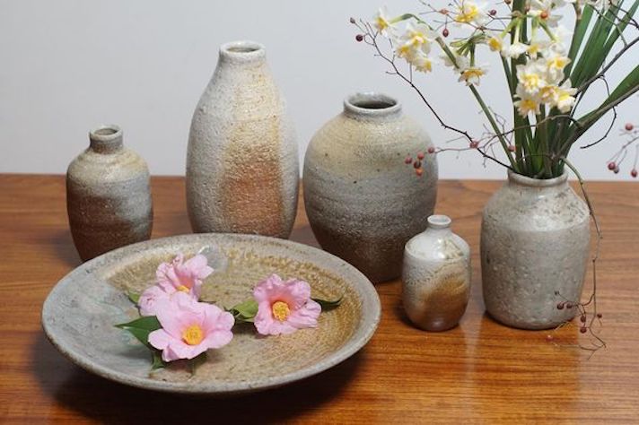 今回の私の作品はシンプルな形と、自然の木の灰を釉に使った作品です。幸い小布施の葡萄農園の方から葡萄の灰を、伊勢原のみかん園の方からみかんの灰を頂くことができ調合した釉を使います。他にも檜、樫、赤松などの灰も使います。それぞれに調合の違いを超えた特有の色合いがあり興味深いです。