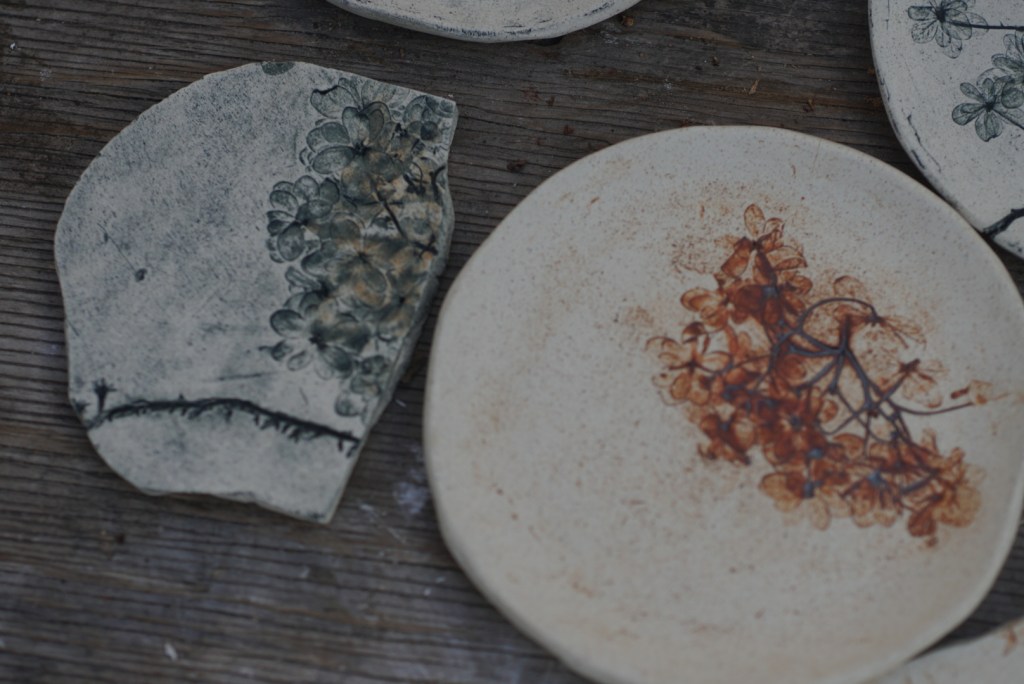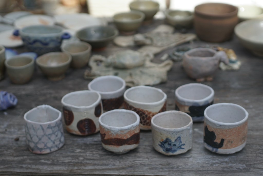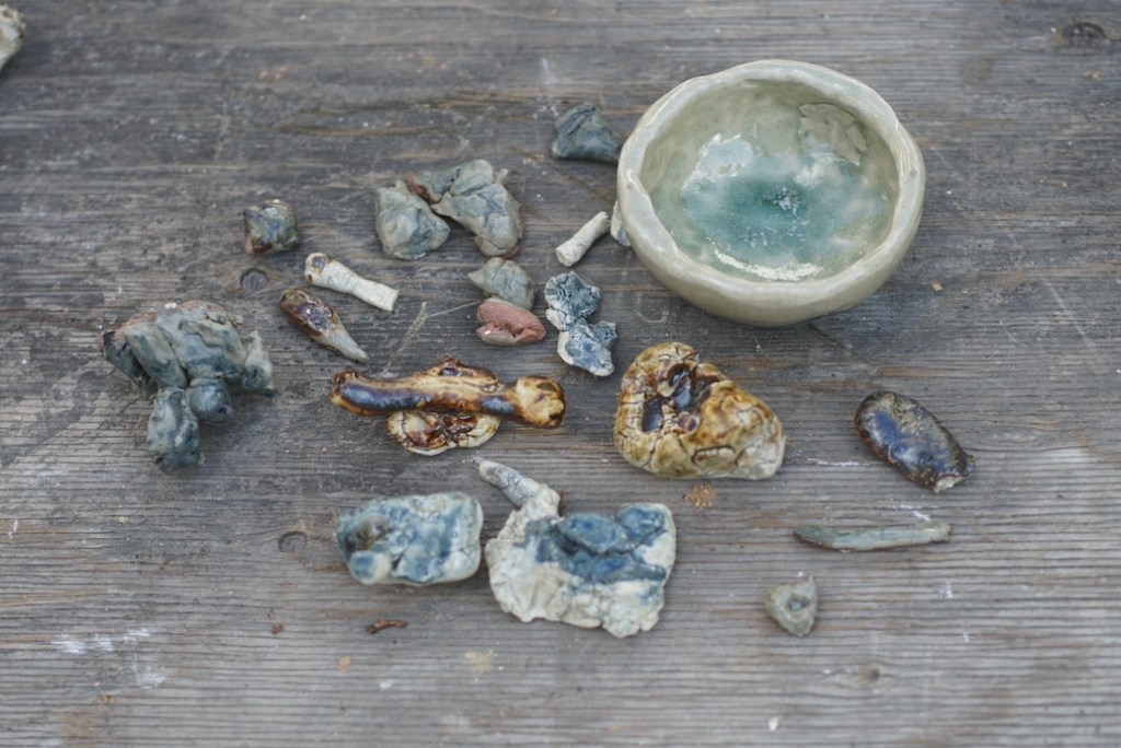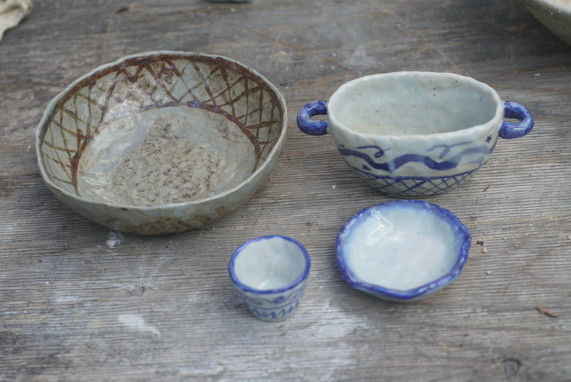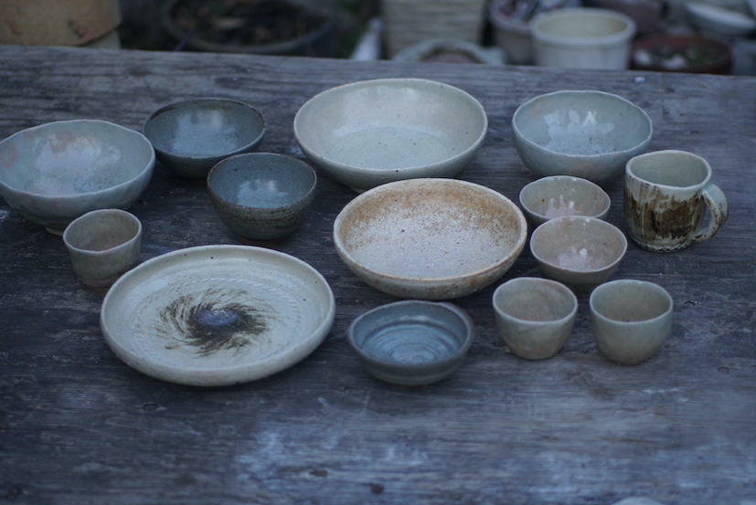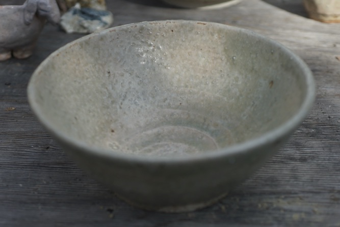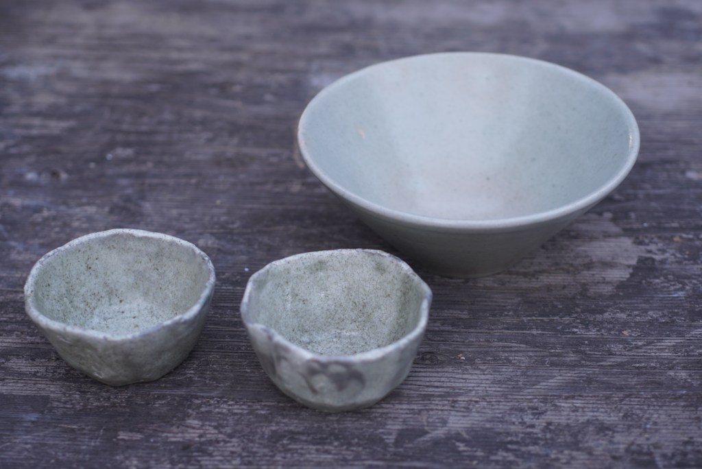 後ろの作品は使いやすそうなボウル、恵那山土灰を調合した艶消の釉を使いました。柔らかな感じの青磁色に焼けました。手前の小さな器は白化粧をし、蜜柑の灰を調合した釉をかけました。