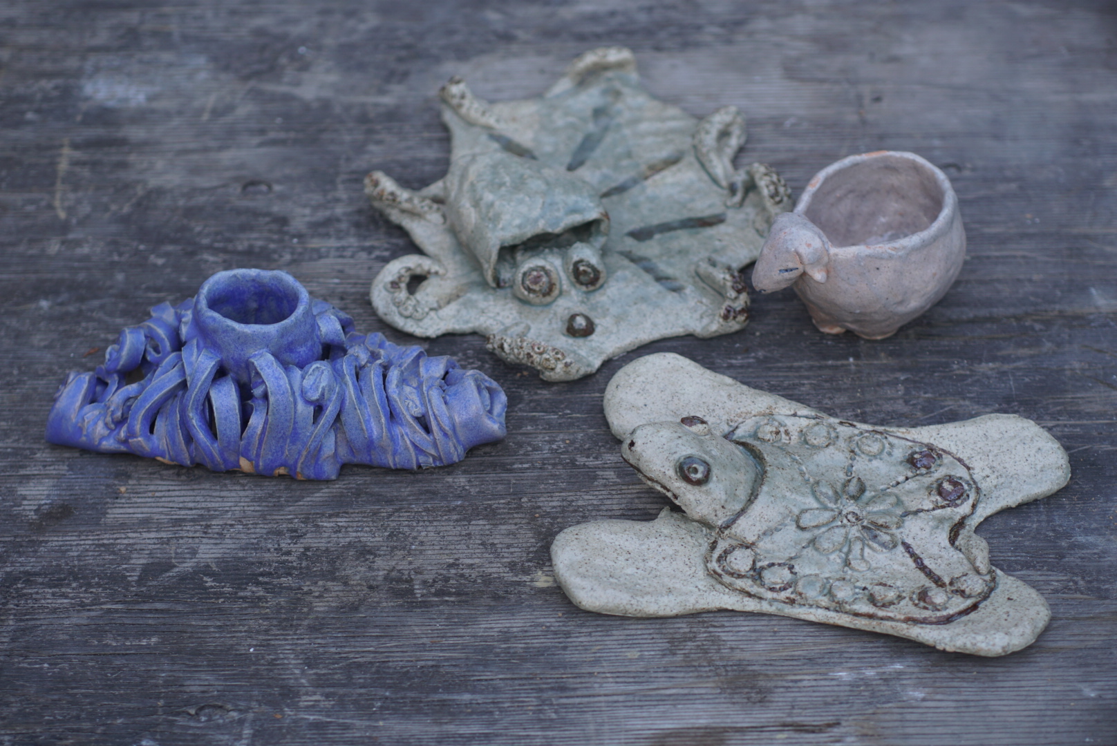 3歳のお子様とお母さまの作品です。お子様は粘土で遊ぶのが好きです。いろいろな形が直ぐにできるのは楽いです。色をつけて本焼きするといつまでも変わりません。