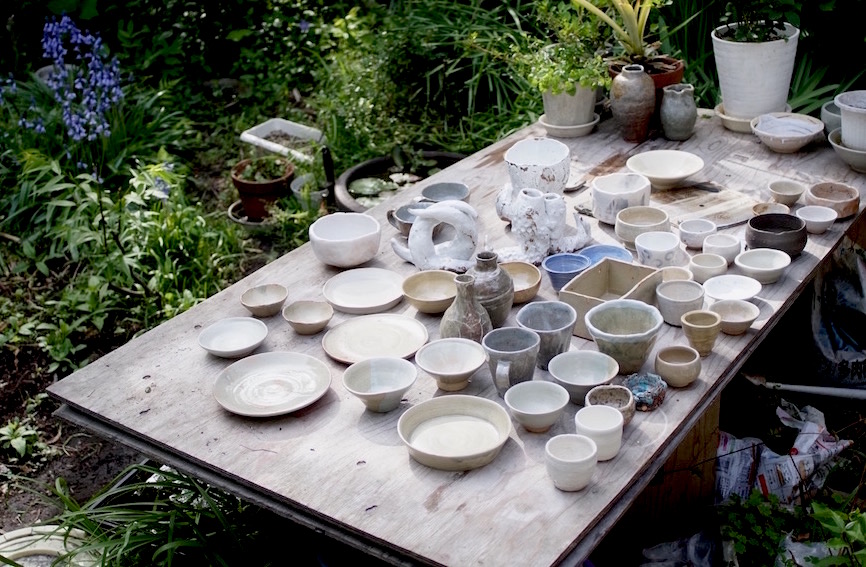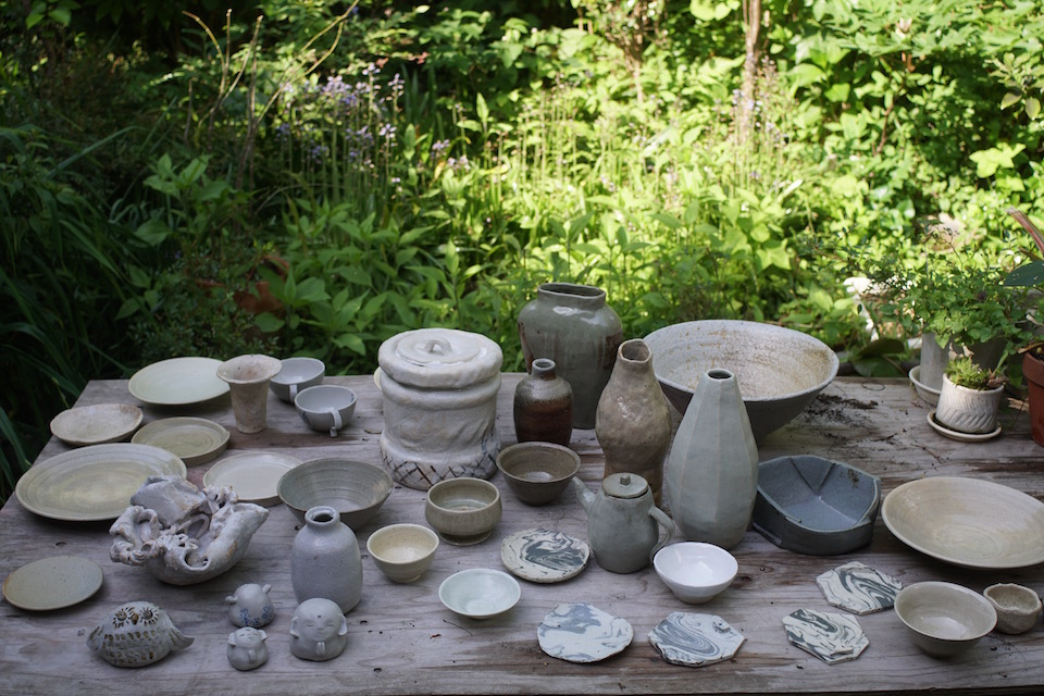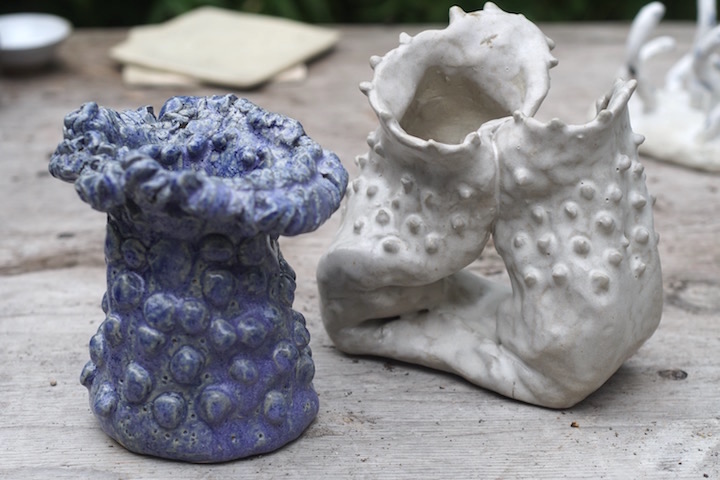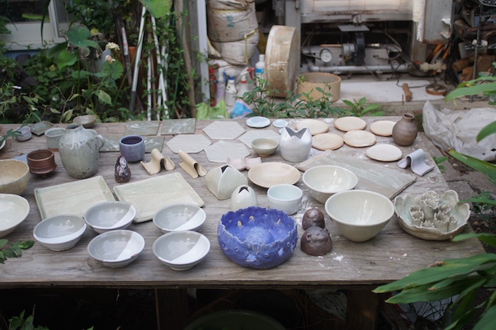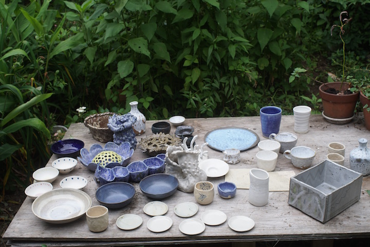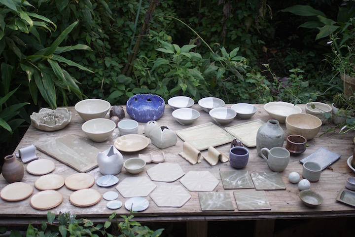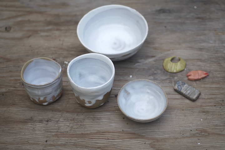 黒土を使った手びねりや板作りの自由ないろいろな作品。釉は亜鉛白釉を使いました。上の電動轆轤を使った作品と随分雰囲気が違った