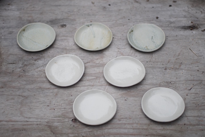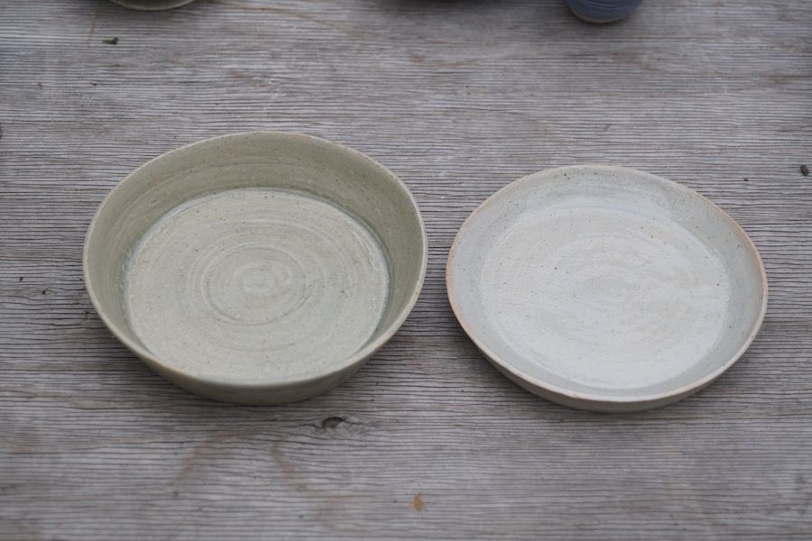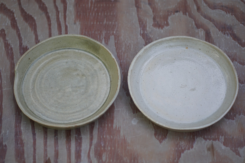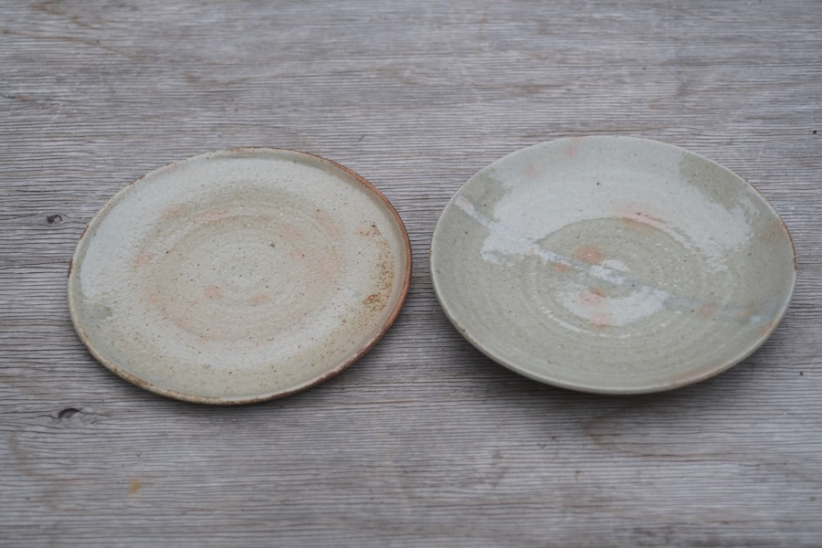 板作り、紐作りと電動轆轤を併用して造られた平皿です。失敗は少ないやり方ですが大きさを揃えたり平らな面を作るのは意外と難しいです。左は千倉石釉、右は赤松灰釉を使いました。両方とも紫月窯オリジナルの釉を使いました。