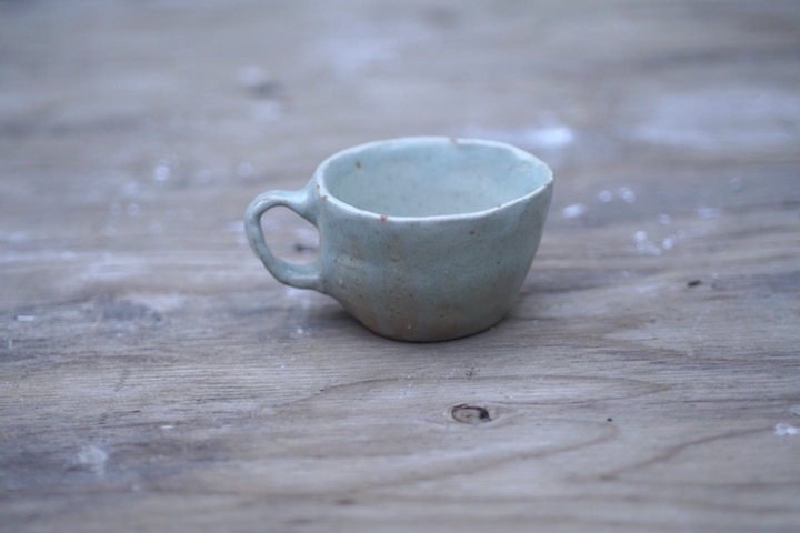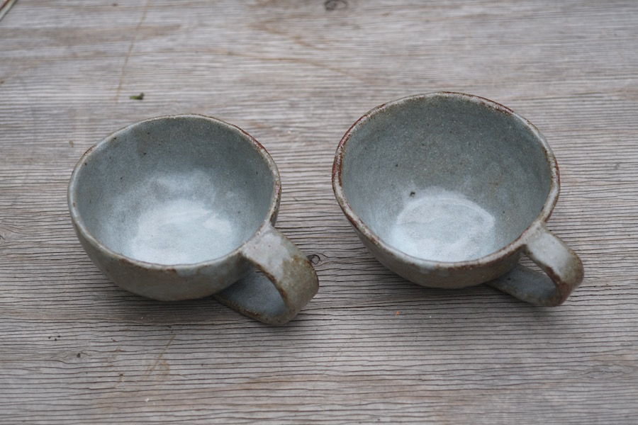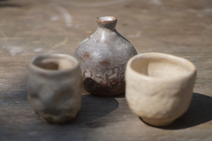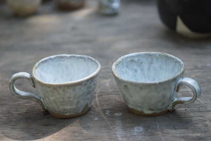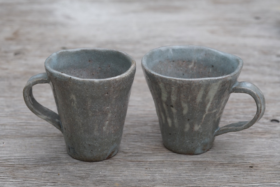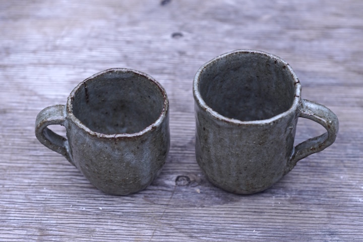 手びねりで丁寧に作られたマグカップと蕎麦猪口。赤土にオリジナルの恵那山土灰釉を施釉、還元焼成しました。これらの作品にぴったりの発色です。