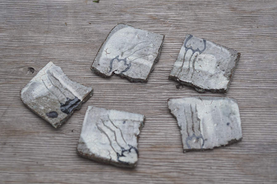 猫が大好きなYFさん。猫の爪痕をデザインした箸置きとのことです。頁岩土に白化粧を施し爪痕は先の細い道具で引っ掻いています。そして素焼きをし黒呉須で猫の足を描き土灰釉を施釉しました。