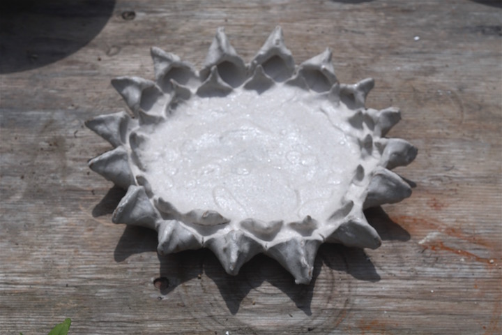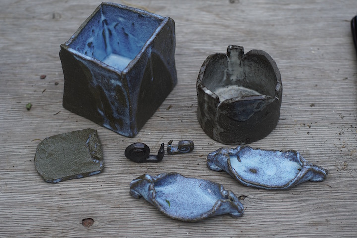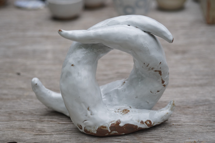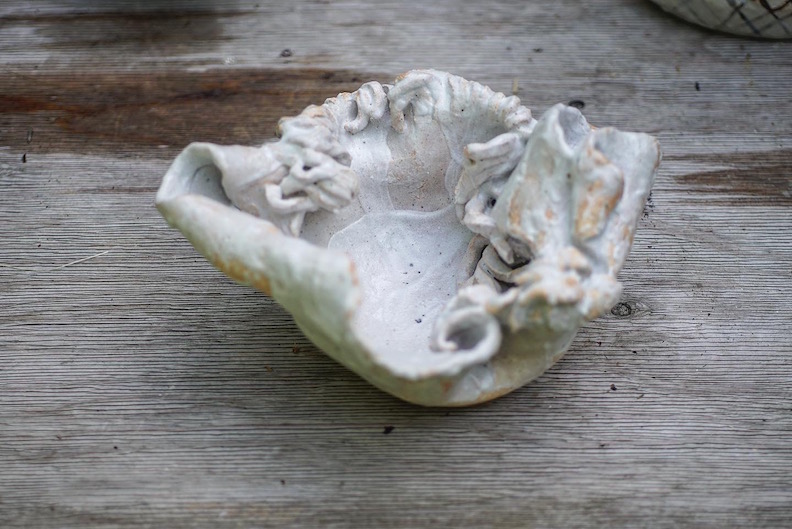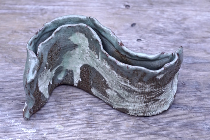 お皿として使ってみたくなる様な二つのオブジェ。ユニークな作品です。いつも作りたいものをイメージして来られ、あっという間に作り上げます。上の作品は淡い水色を出したくていくつもの減量を調合した釉、焼くたびに毎回表情が変わります。下の作品は本来は還元焼成する長石単味の釉ですが今回酸化焼成しました。酸化ですとやはり溶け難いことが分かりました。