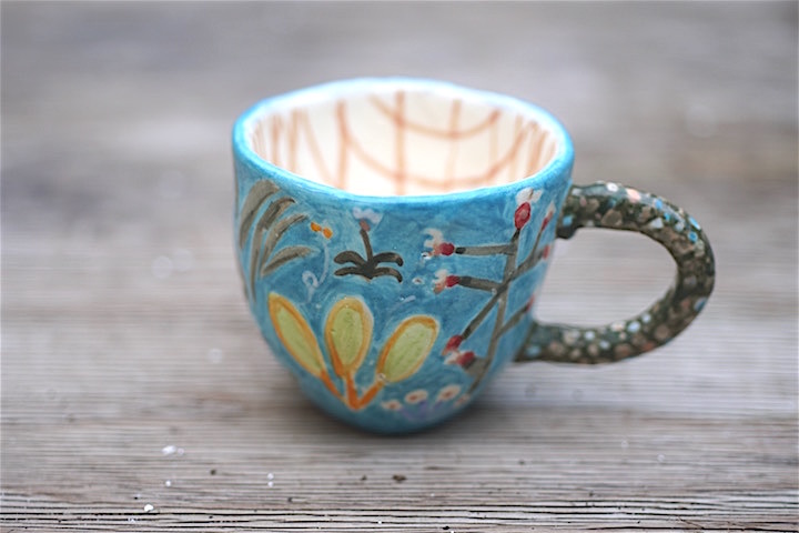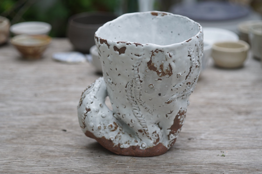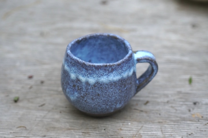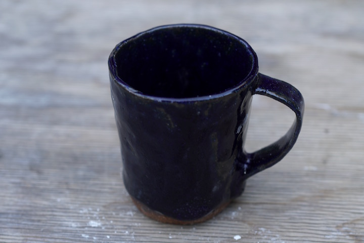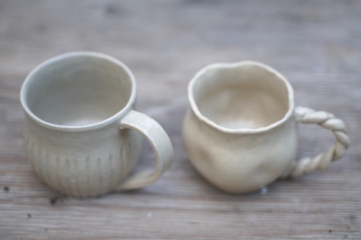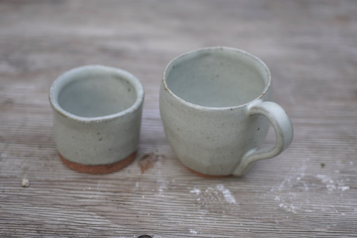 黒土を使った手びねりのマグカップ。亜鉛白釉を掛けました。上の部分は二重掛けしたため明るい白がアクセントになっています。