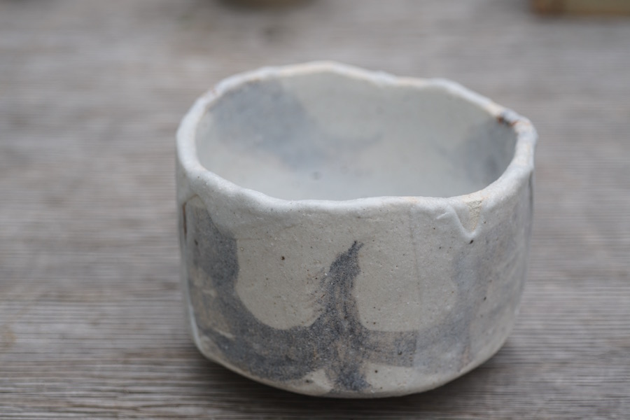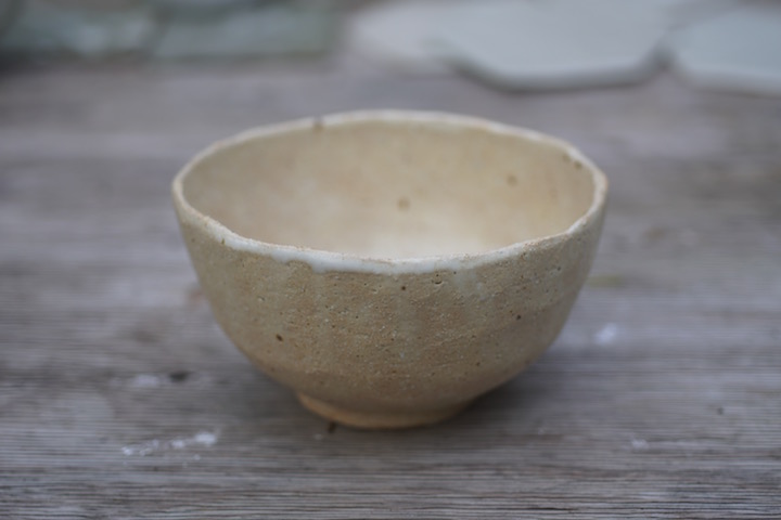 手びねりの抹茶茶碗。古陶黄瀬戸というもぐさ土を使いました。口のところは白萩釉を使いました。天然の藁灰を使った白萩釉は本来は酸化で焼きますが、今回は還元のかかりが弱かったのか白萩釉の柔らかさが出ました。