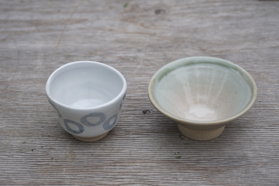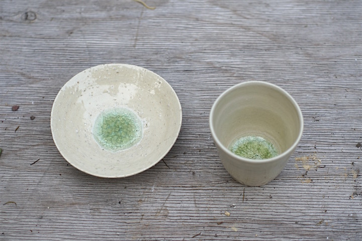 電動轆轤を使った二つの作品。中央部の透明な緑色はワインの瓶を割ったガラス片です。無色透明な三号釉との組み合わせで爽やかな作品になりました。