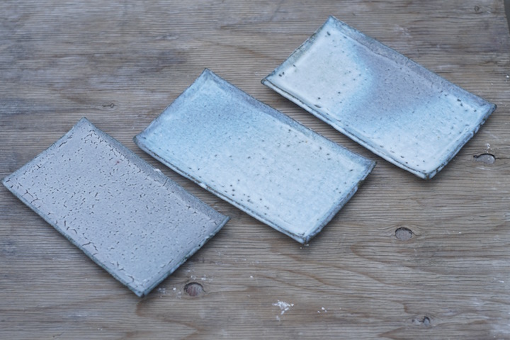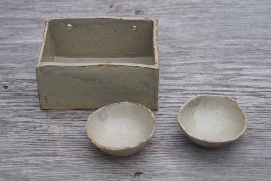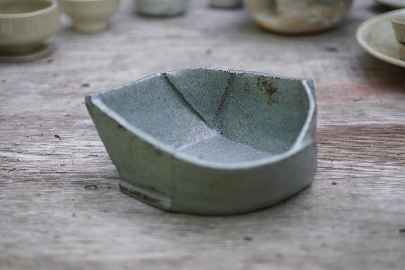 板作りの箱と手びねりの暖かさのある小皿、釉薬は3点とも千倉石釉です。弱還元の千倉石らしい発色です