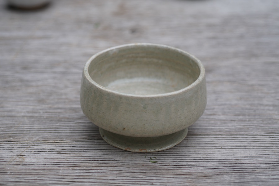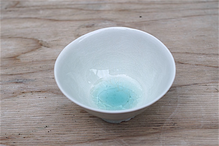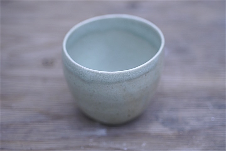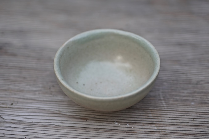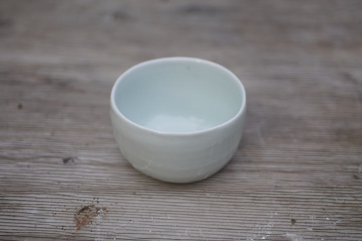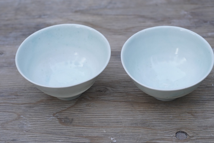透光生の磁土を使った器。電動轆轤挽きしました。難しい磁土ですが良くできています。天然の土灰を還元焼成することによって出来た淡い青磁色が美しいです。