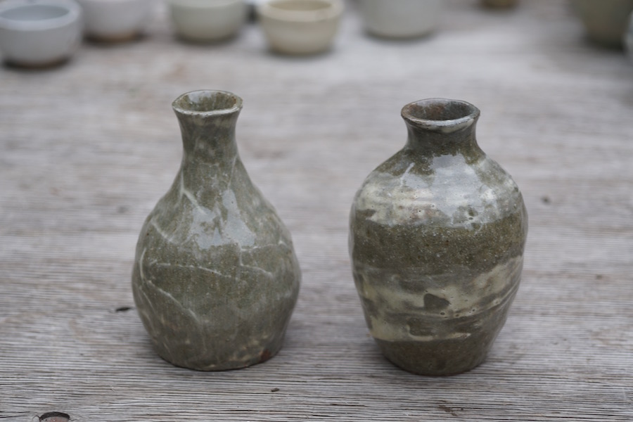 2つの不思議な形の器、どうやって使おうかな。とてもユニークな作品です。左の作品に使った釉、酸化で焼くことを念頭に調合した釉ですが、還元で焼くと随分違った発色になりました。これも良いかな。右は今回初めて購入した材料店の天然土灰を使いました。還元でやわらかで適度な青磁色が出ました。この釉、これから紫月窯の土灰釉の中心になるかもしれません。
