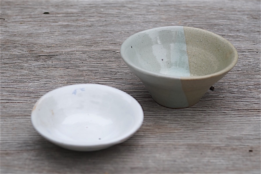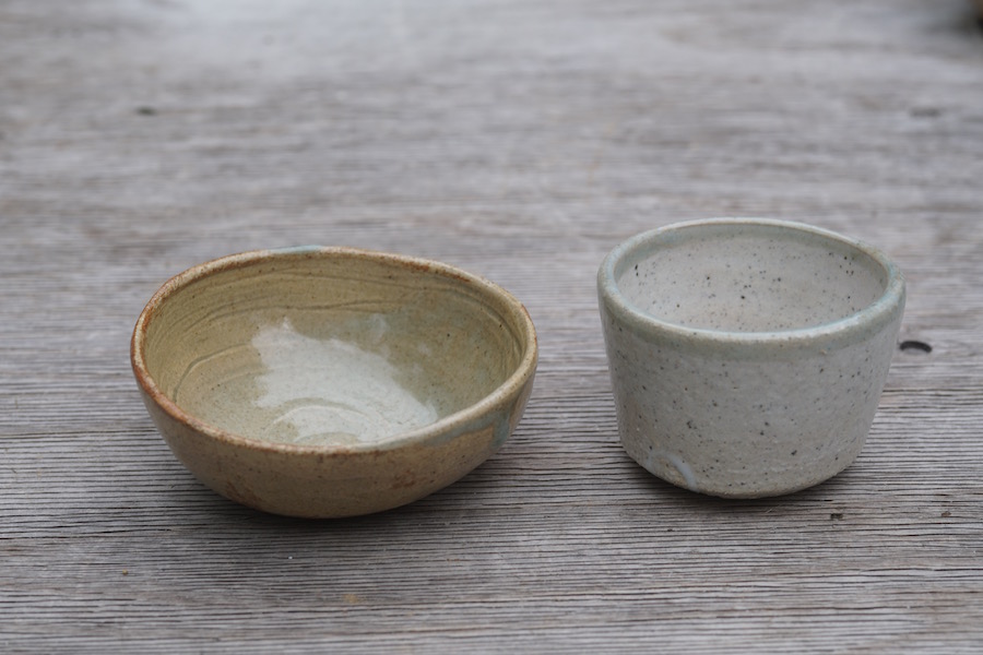 電動轆轤を使ったまだ数回目の作品です。少し歪みがあるのも温かみがあっていいと思います。轆轤に慣れると作れない形です。右の作品は底を削っていて穴を開けてしまいました。轆轤を使うと誰でもが経験します。