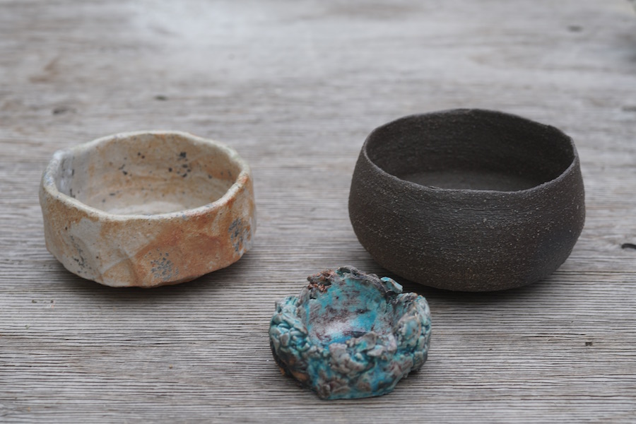 いつも新しい試みをされます。後ろの二つは鞘に入れて焼きました。白い土を使った左の作品は緋色が面白くでました。黒土の作品は藁を巻きましたが量が少なかったのでしょうか、殆ど変化がないようです。手前の作品は削った後の粘土をそのまま使った作品、トルコ青釉は普通は酸化で焼きますが敢えて還元でということでした。