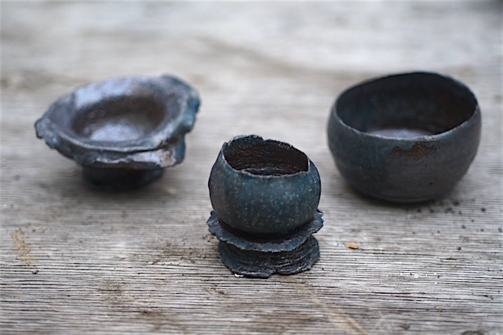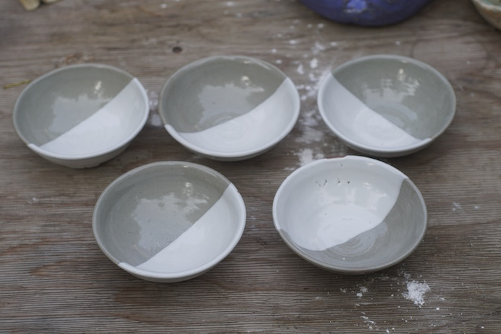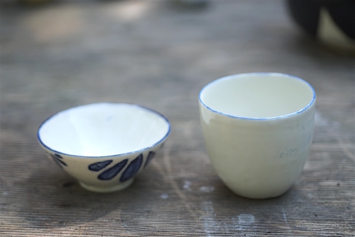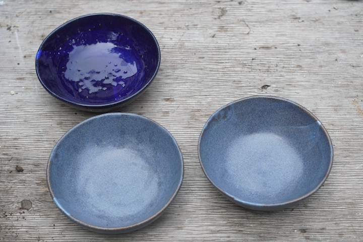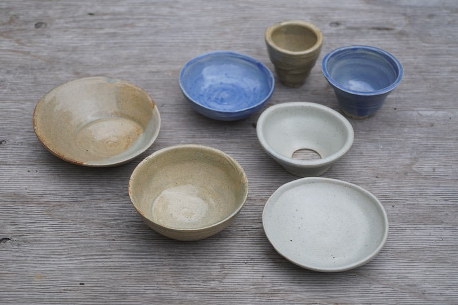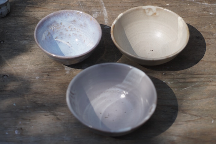 電動轆轤で作った器。形や大きさが揃ってきました。手前の二つの器は呉須を主原料にしたMMさんオリジナルの青釉です。
