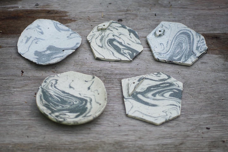 線香立て。入会して間もない生徒さんですが、いろいろ新しい試みをされます。黒土と白土を合わせて軽く練ってマーブル文様を作りました。釉は透明マット釉の還元です。