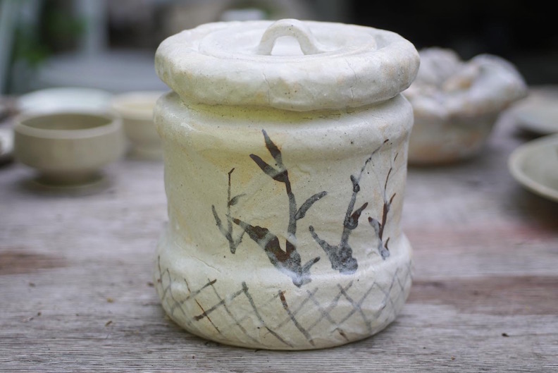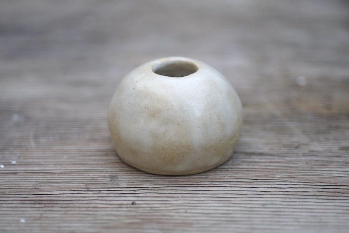 手びねりの小さな壺。天然藁灰の白萩灰の発色が良いです。