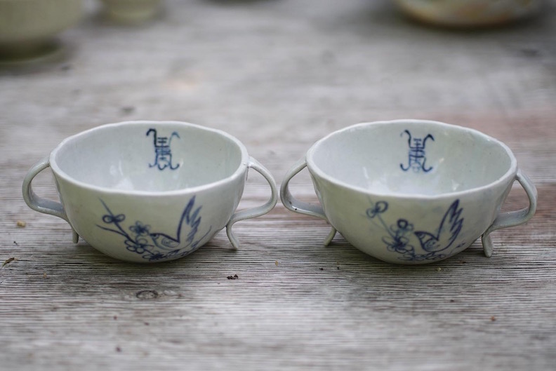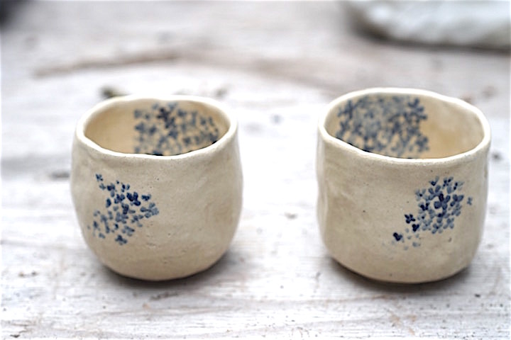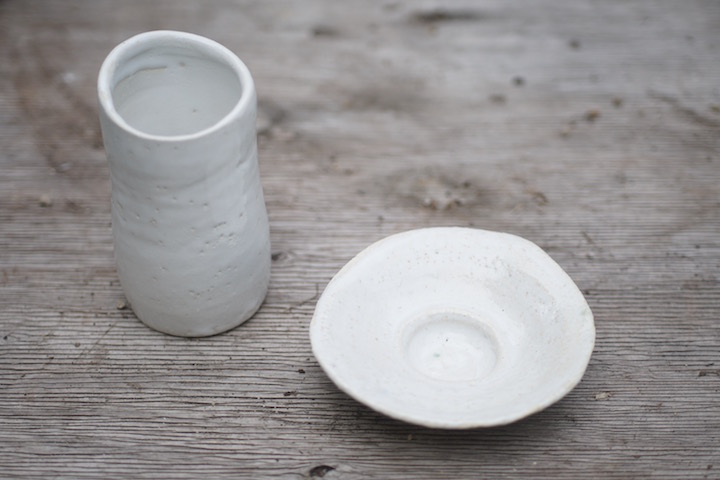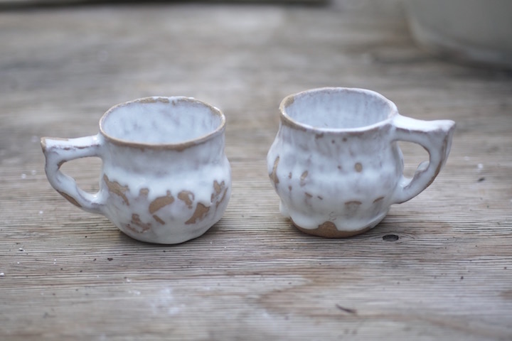 初心者コースの2つ目の課題、取っ手の付いた容器を二つ作ってtいただきました。手びねりらしい柔らかな形です。このあと黄色の上絵の具でミモザの花を描く予定です。