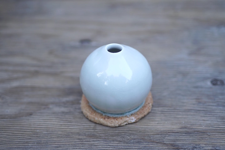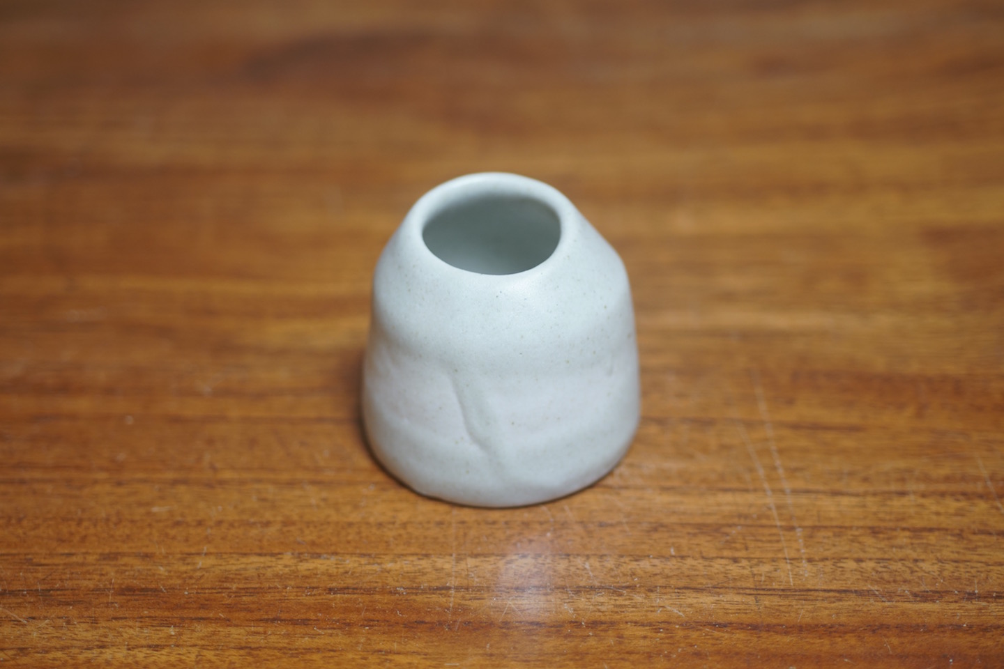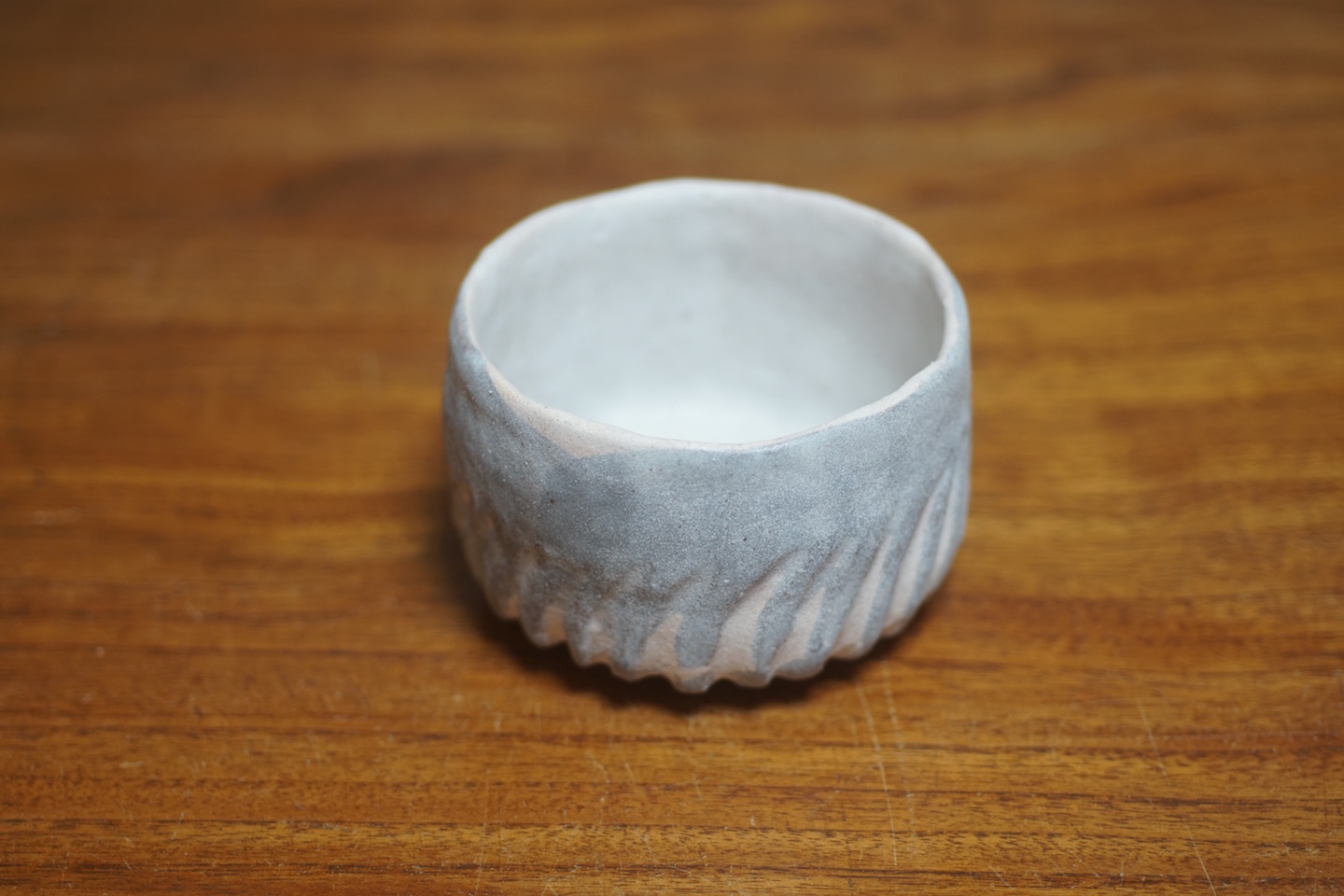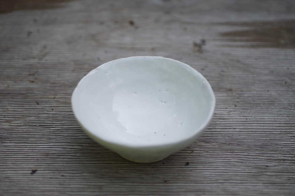電動轆轤を使った回数は多くはないのですが透光生磁土を使ってみたいといことでできた作品です。磁器土は腰が弱く慣れないと非常に轆轤成型し難いです。上の部分が歪んでしまいましたが、それを生かして作品にしてみました。