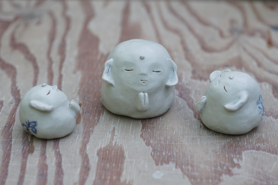 半磁器土を手びねりで作りました。後ろ側に呉須で絵付けし透明マッ釉をかけました。優しい表情のお地蔵様です。