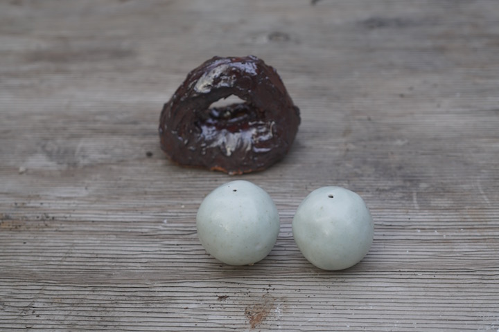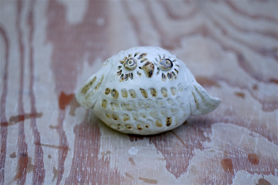 フクロウのオブジェ。新聞紙を丸めその上に粘土をのせて作ります。紙は燃えてしまいますので中が空洞になり乾燥しやすくなります。鬼板で彩色した目の表情が愛らしいです。