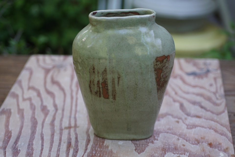 赤土を使い手びねりで作った袋物の花瓶。天然赤松灰を使った釉をかけました。溶け過ぎず半ツヤになりました。少し釉切れしたとこも自然な感じがします。早速花を飾りインスタにアップされていました。苦労して焼成した甲斐があります。