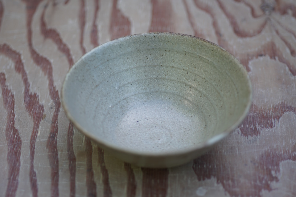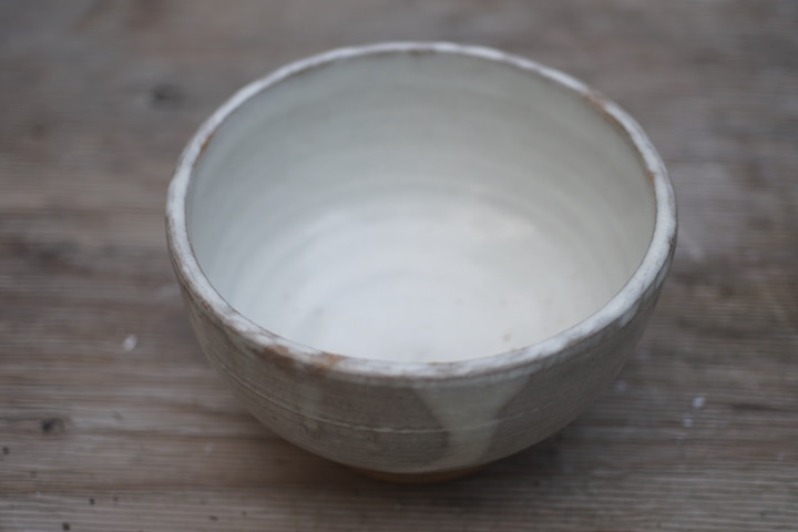電動轆轤引きしたご飯茶碗。使いやすそうな大きさと形です。釉は天然藁灰を使った白萩釉です。微妙な色の変化が綺麗です。