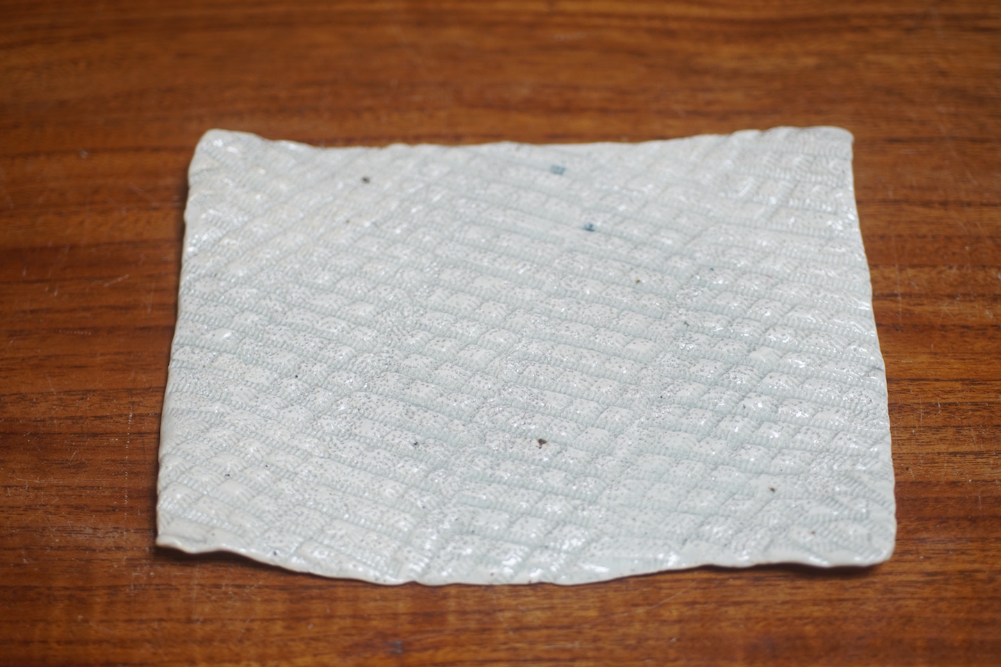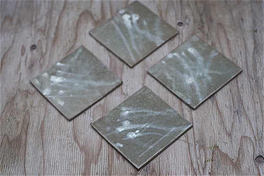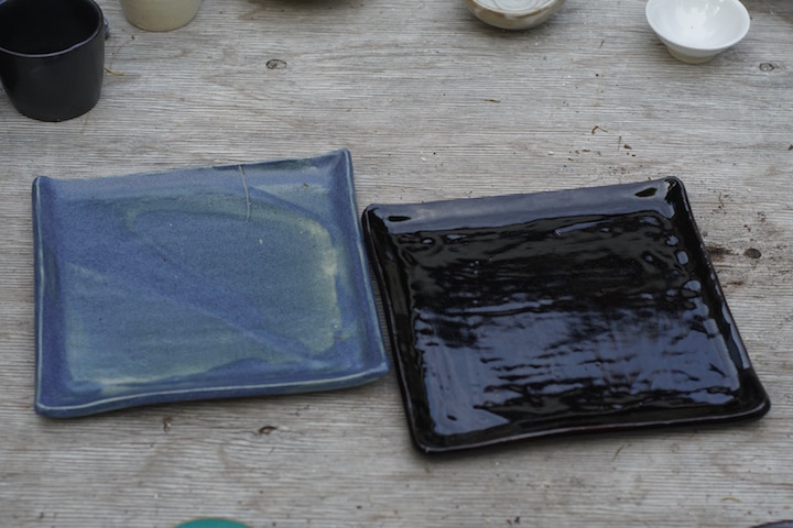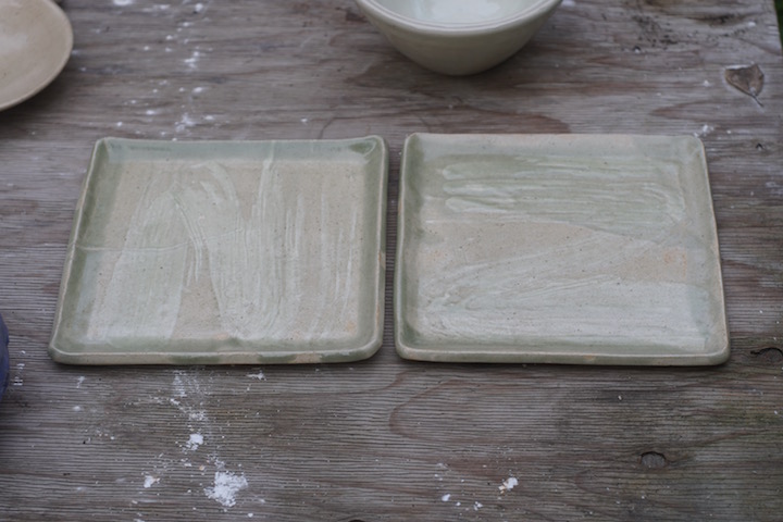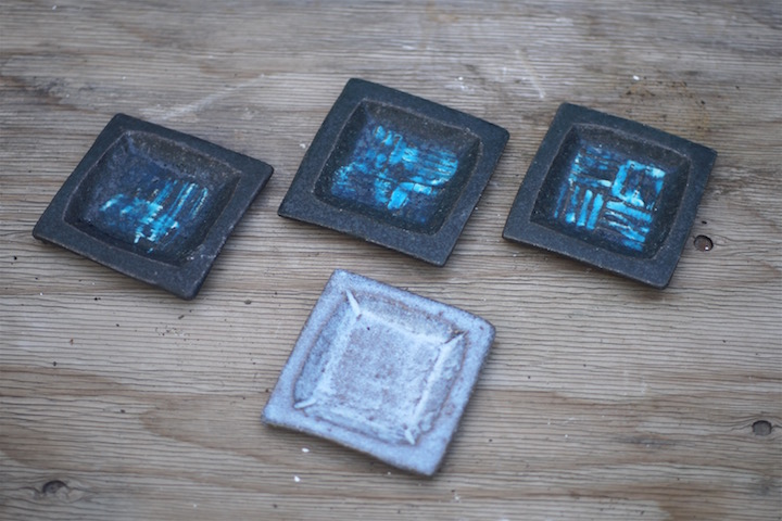 前回酸化焼成した4つの同じ形の削り出しの角皿の一つ。一つだけ松灰釉還元の指示が書かれたものです。松灰釉は還元がうまく掛かると強い緑になりますが、透明なので黒土に施釉した場合胎土の黒に負けてここまで緑色になるとは思いませんでした。この組み合わせ、いろいろな可能性がありそうです。