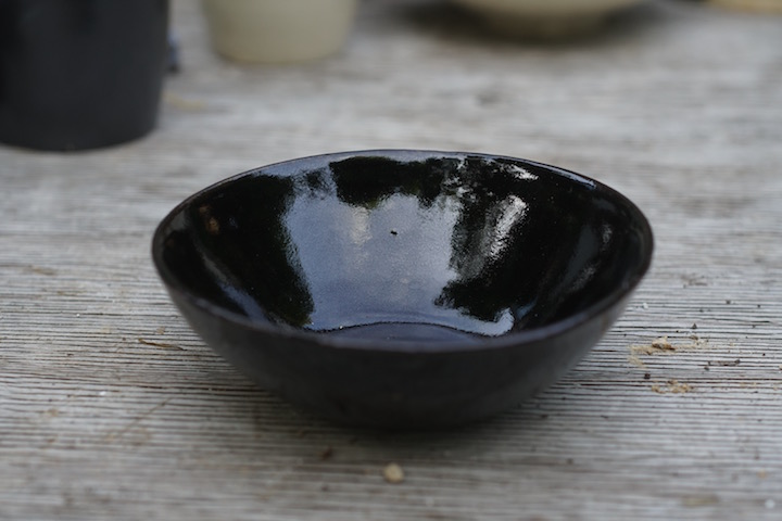 電動轆轤を使いこなしています。大きな鉢。左は黒天目釉、光沢の強い黒い釉。ムラなく釉掛けされています。右は白萩釉を施釉しました。