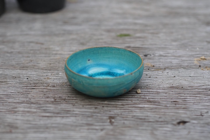 見たこともない不思議な美しい色の作品です。赤土を使い轆轤引きしたものにトルコ青釉とマンガン釉を二重掛けしたようです。金属色のような結晶が出た部分もあります。