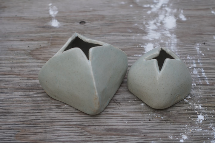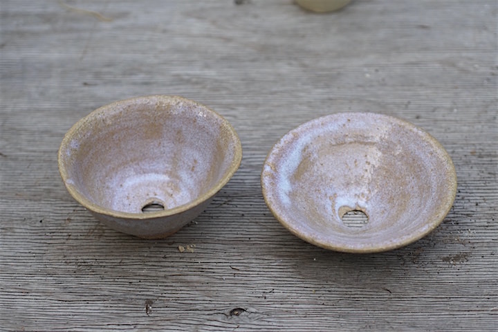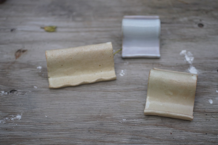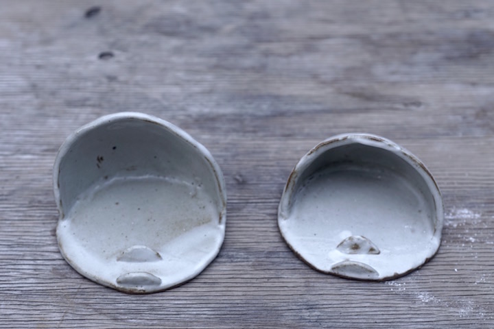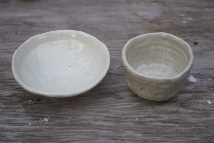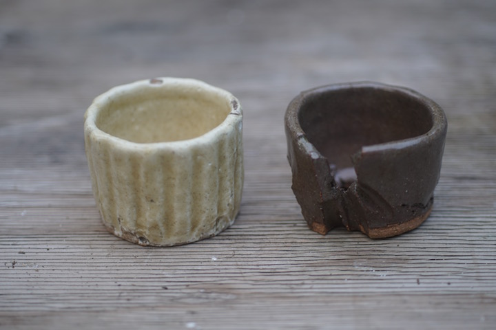 厚目に作ってしのぎ削りをした小品。左は白化粧の上に天然土灰釉、白化粧を施したので土灰釉酸化焼成の黄色がはっきりした色になりました。右は削り過ぎて穴が空いたものをオブジェとして作品にしました。
