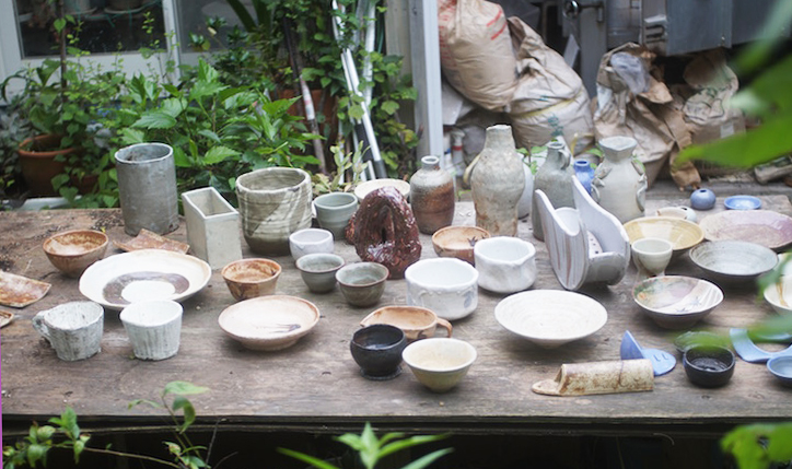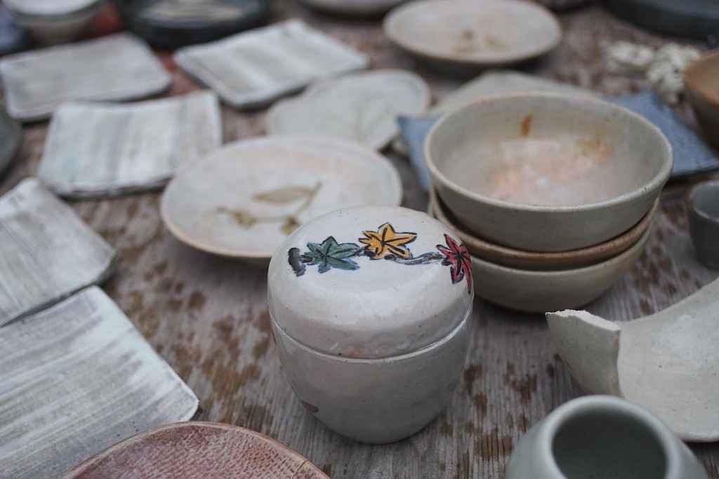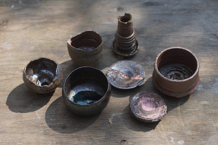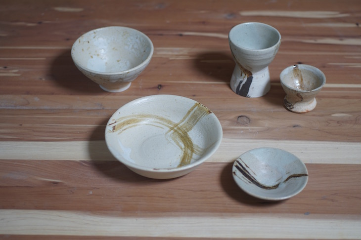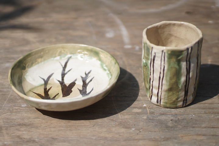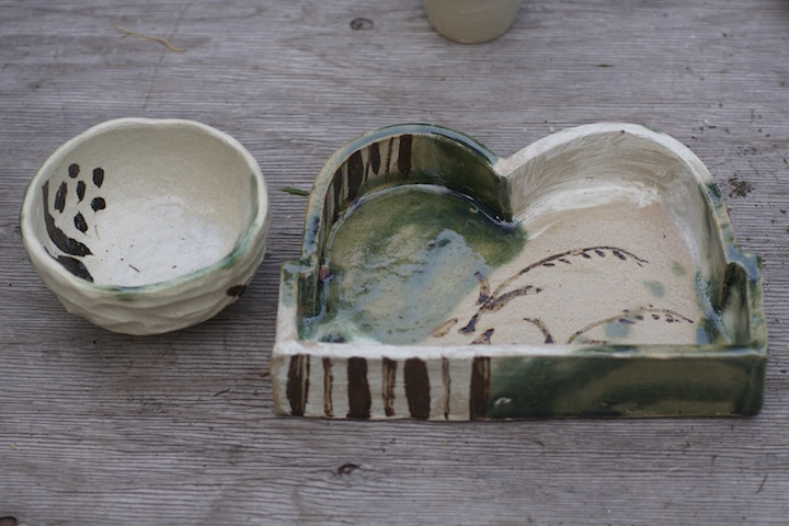 鬼板で彩色された手びねりの作品。どれも味のある仕上がりです。この時使った土灰釉は長石が重く、直ぐに分離して使いにくかったのですが、かえって自然な感じを出しています。