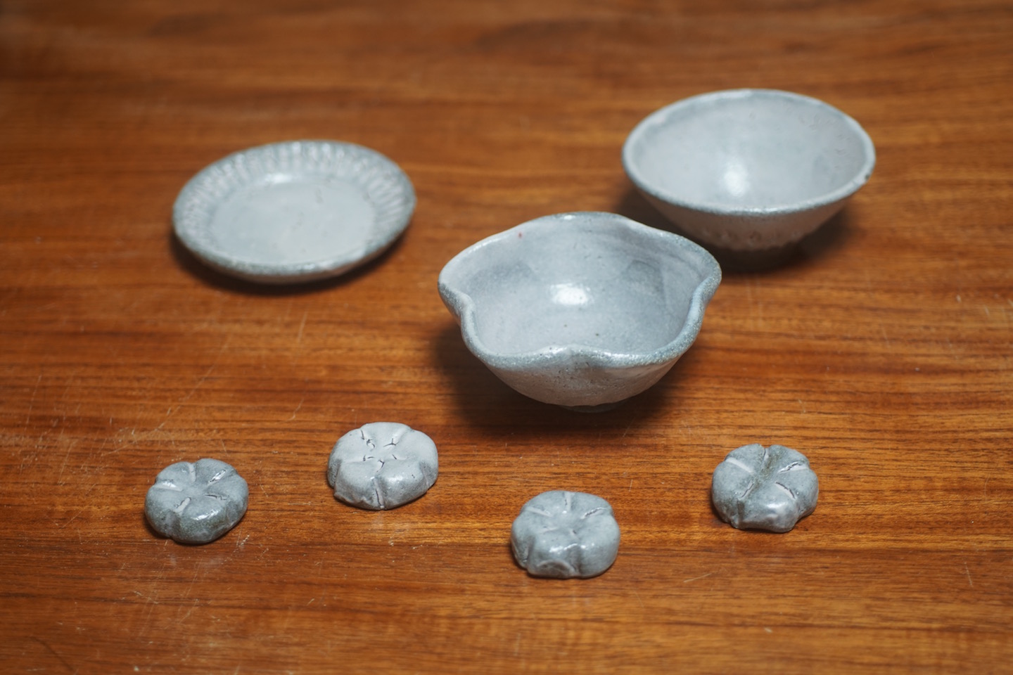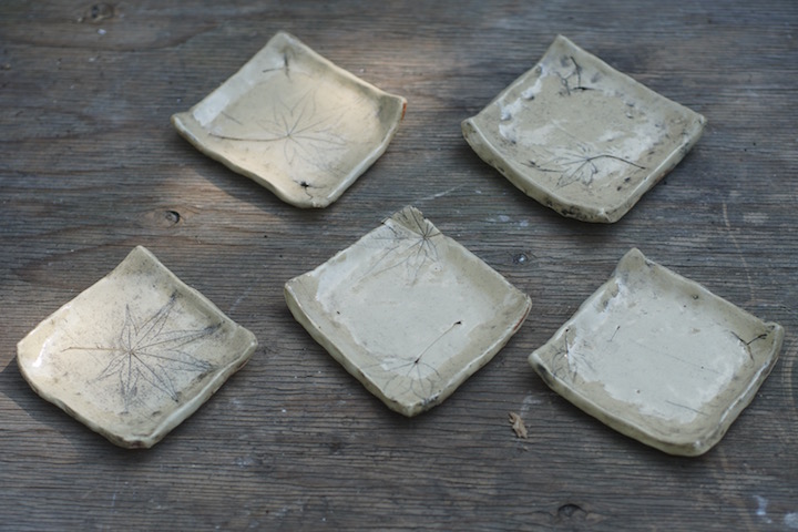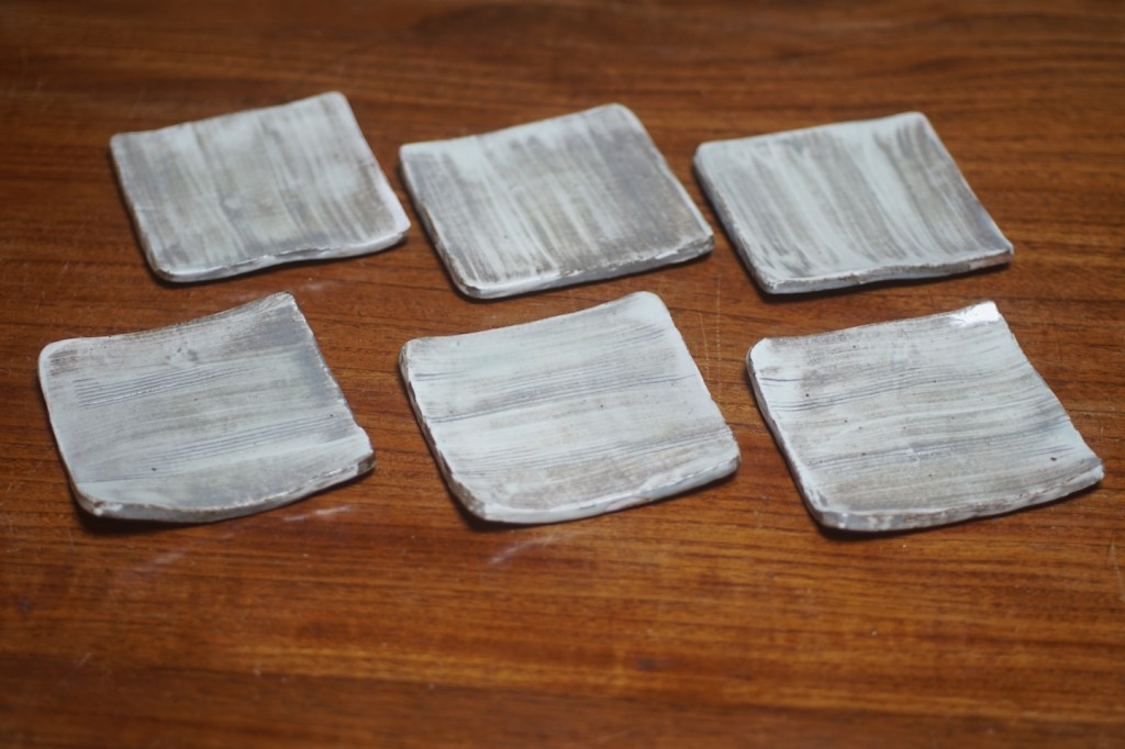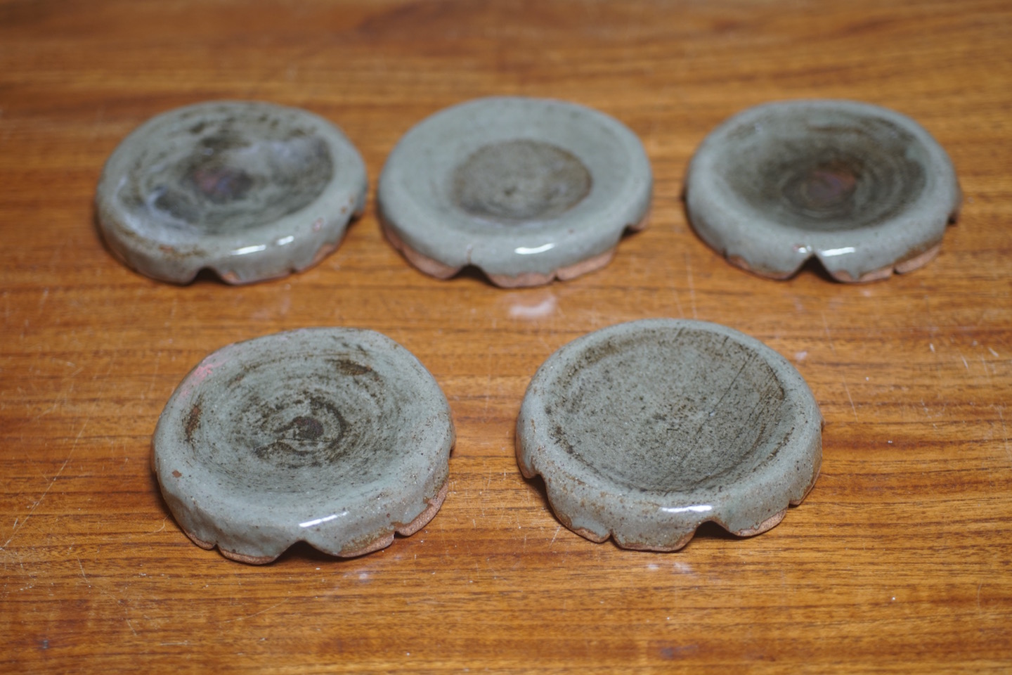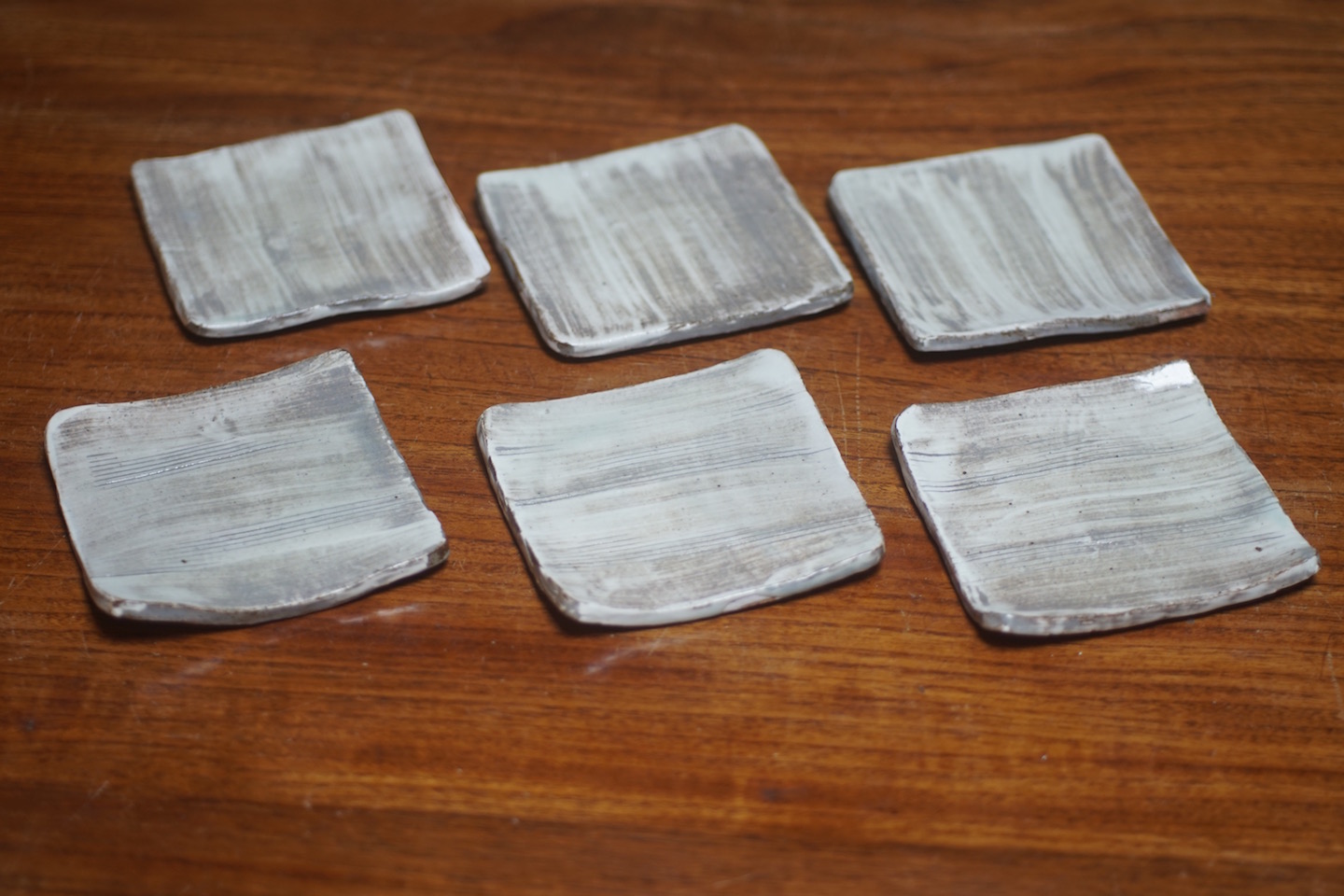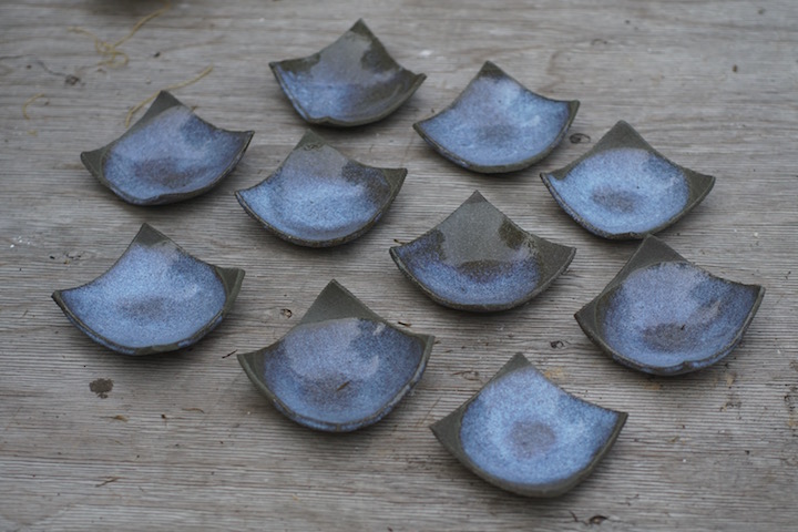 たたら板で同じ形の5枚の小皿を作りました。ゆるいカーブの方を使い、僅かに丸みをつけました。やわらかな色合いが良いです。