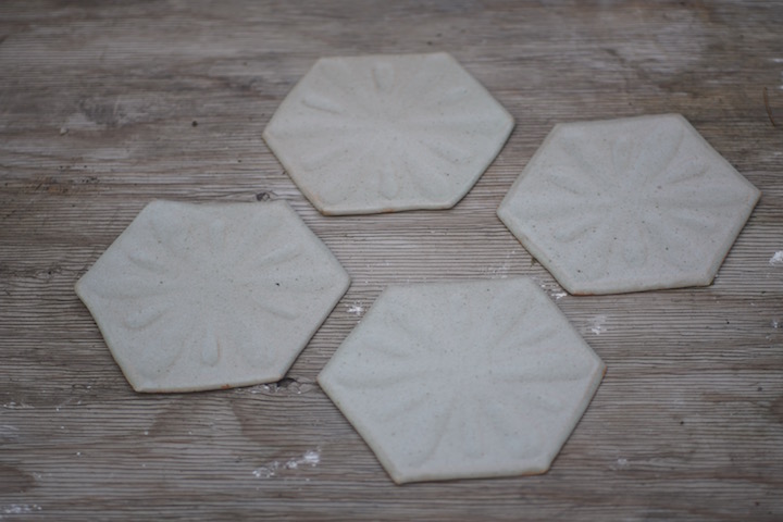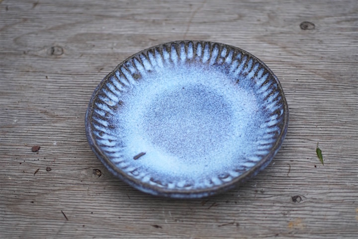 タタラ作りの小皿。6角形の等分な位置にタタラの加飾。凹ました部分に釉がたまって濃淡を作り出す構想でしたがマット釉でしたので色の変化は出ませんでした。これはこれでシンプルで良いと思います。