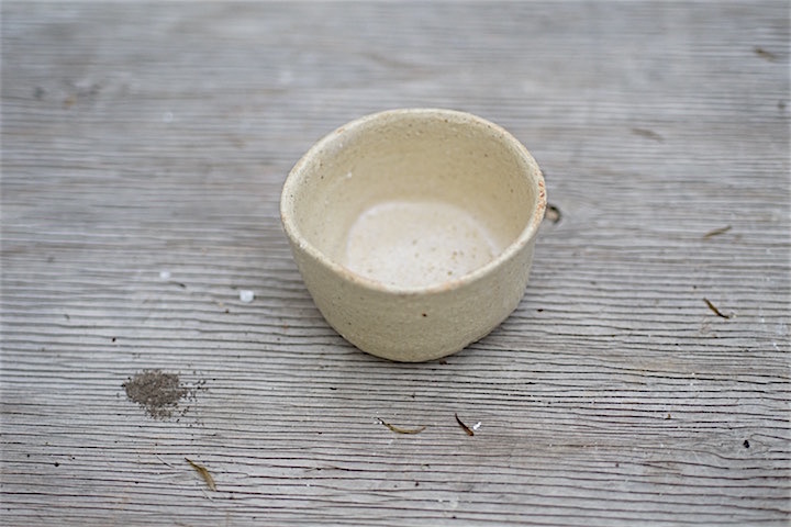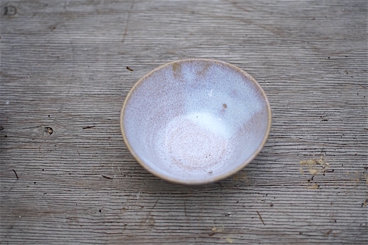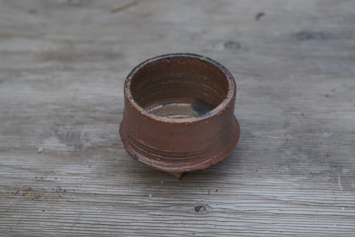 電動轆轤を使った小さな器。赤土に天然土灰釉を掛けています。釉の掛け斑が自然な景色になっています。