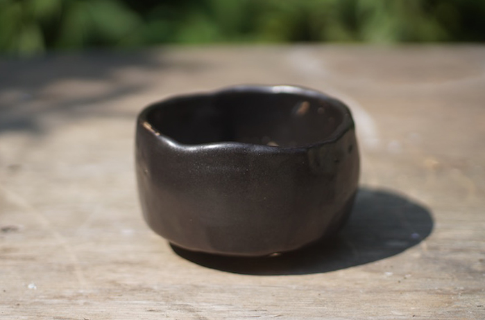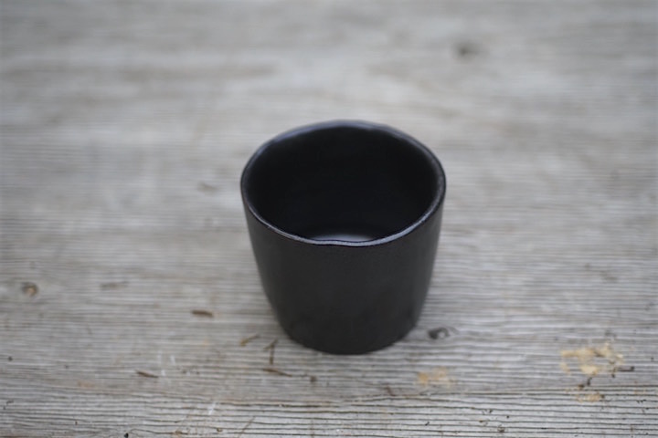 電動轆轤で作ったカップ。電動轆轤に入ってまだ数回ですが薄く良い形にできました。オリジナナルの玉石釉を施釉しました。半ツヤの漆黒です。