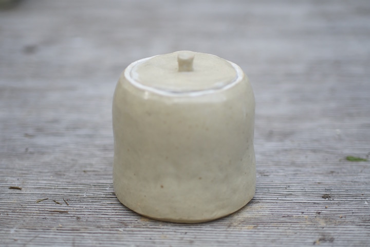 手に練りの蓋つきの器。蓋もぴったり。蓋はアルミナ粉を接触する部分に塗って重ね焼きしました。天然土灰酸化焼成の淡い暖色、いろいろな用途に使えそうです。