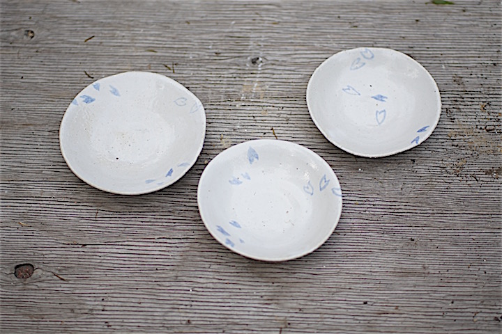 小学校4年生のHOちゃん。電動轆轤をたいへん上手に使って作陶しています。3枚のお揃いの小皿。呉須の絵付けも見事。乳白釉で仕上げました。