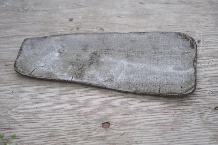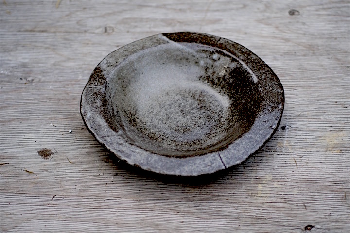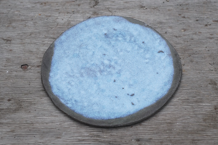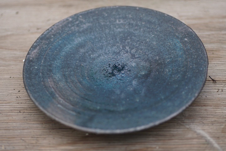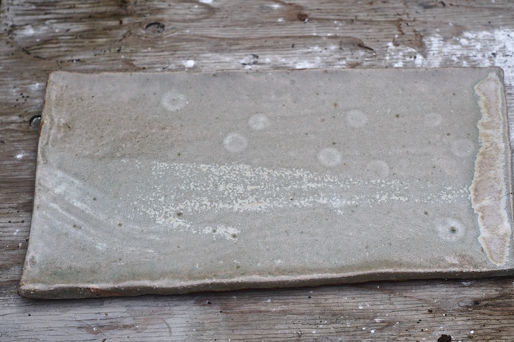 黒土を使って作った板を型で生計した大皿です。釉は最初に作った亜鉛白釉。黒土との合わせで青味がかった色になっています。