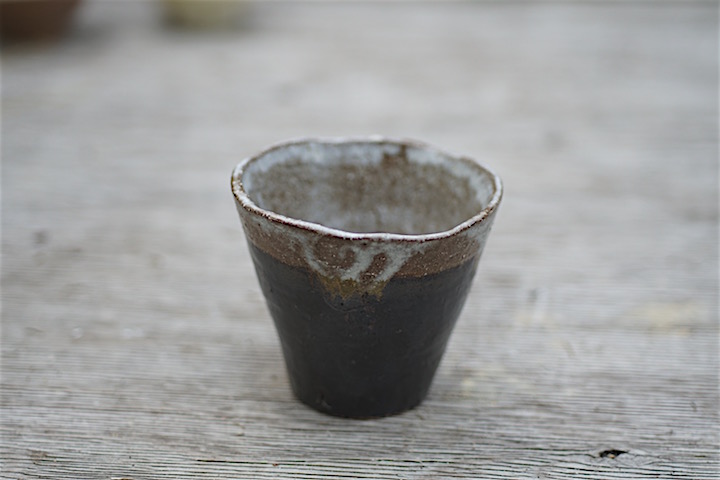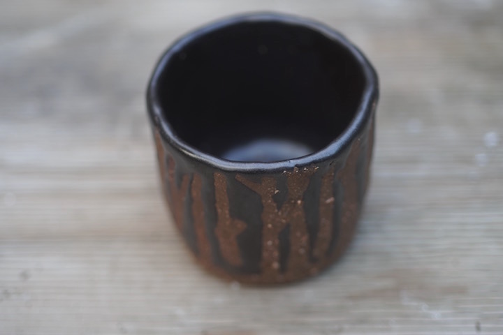 頁岩を使った手びねりのカップ。マスキングして釉の着かない部分を作り、玉石黒釉を施釉しました。見た目の重厚さとは違いとても軽く、使いかってが良さそうです。