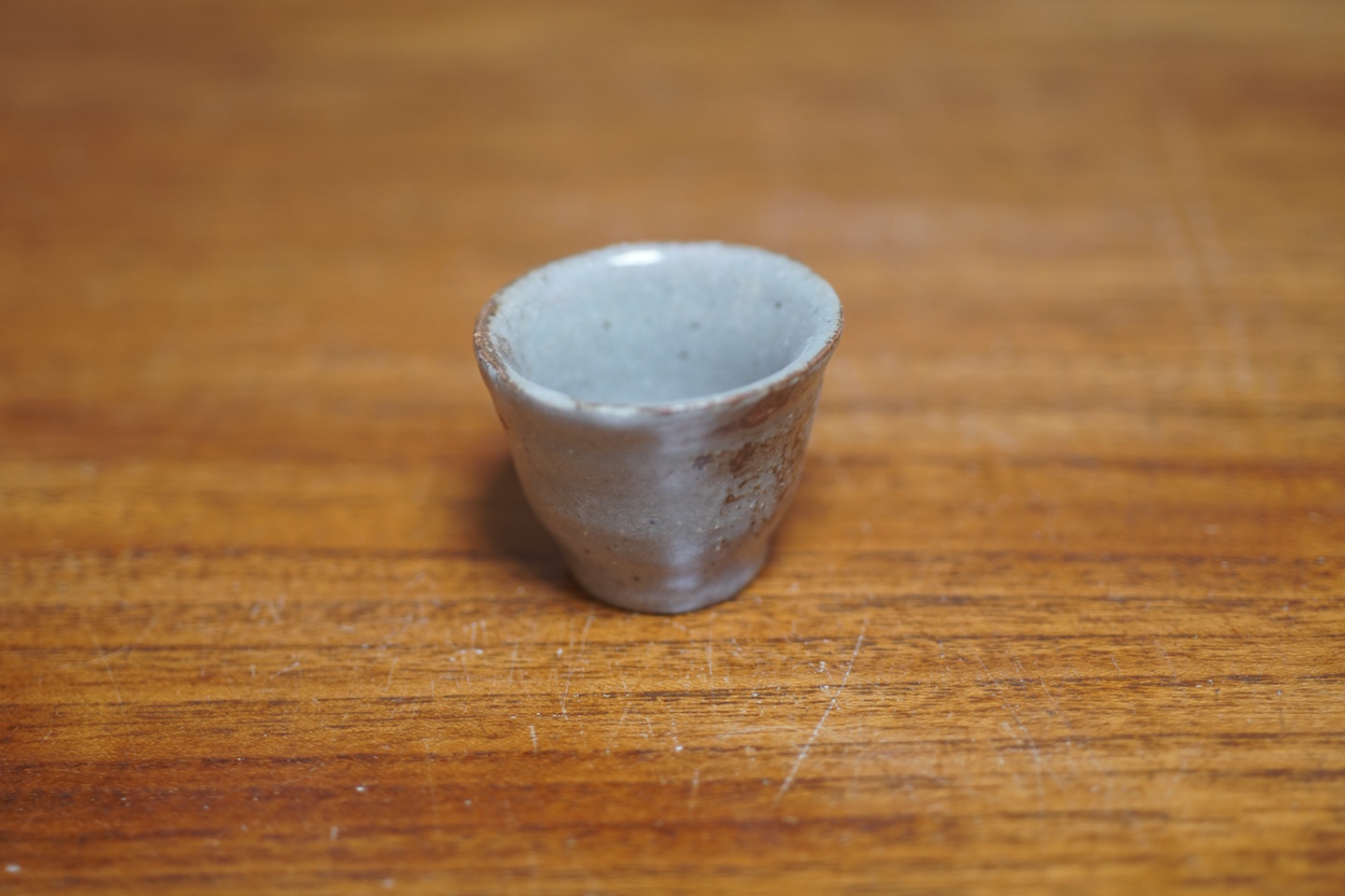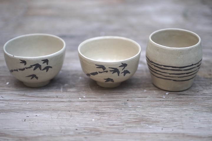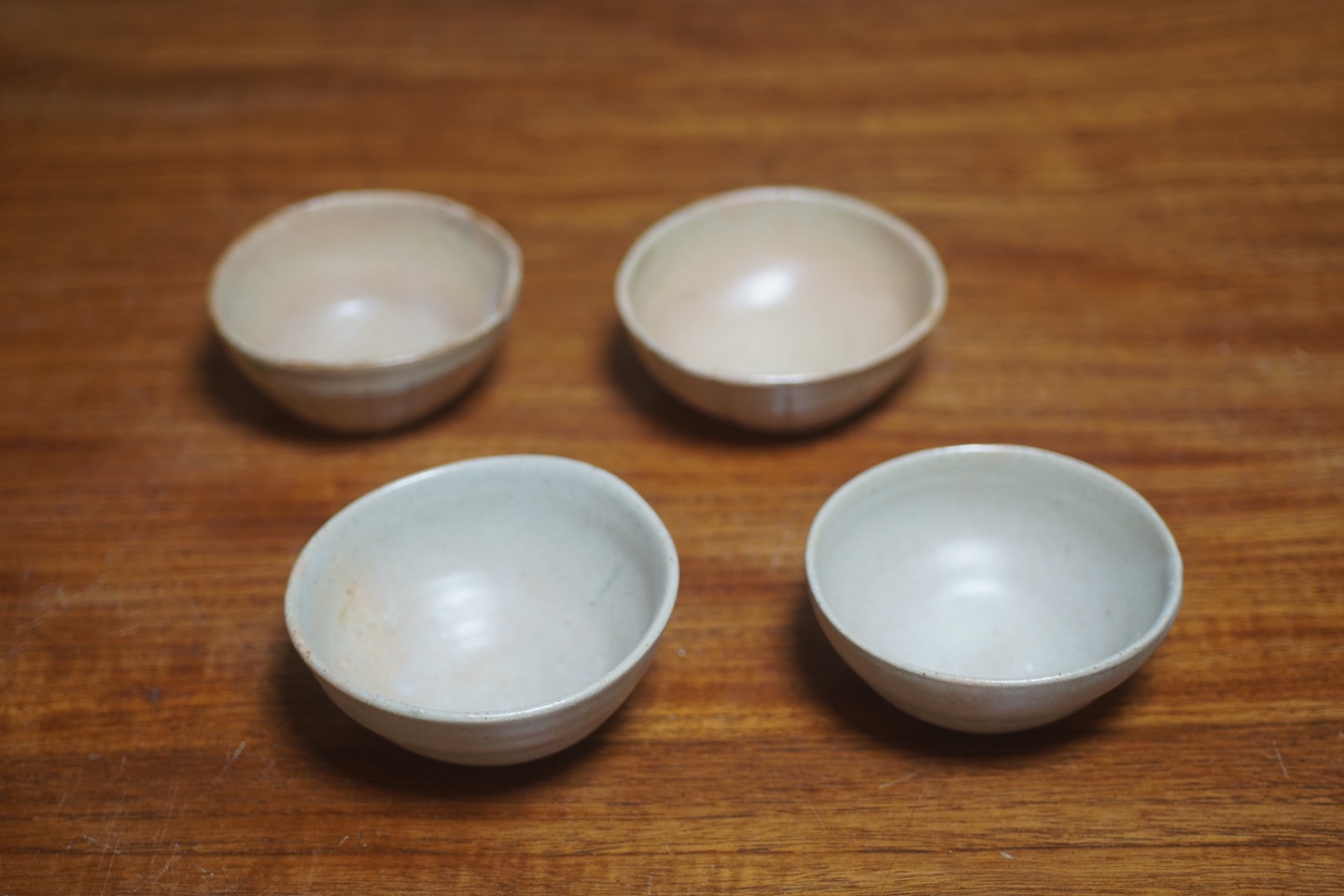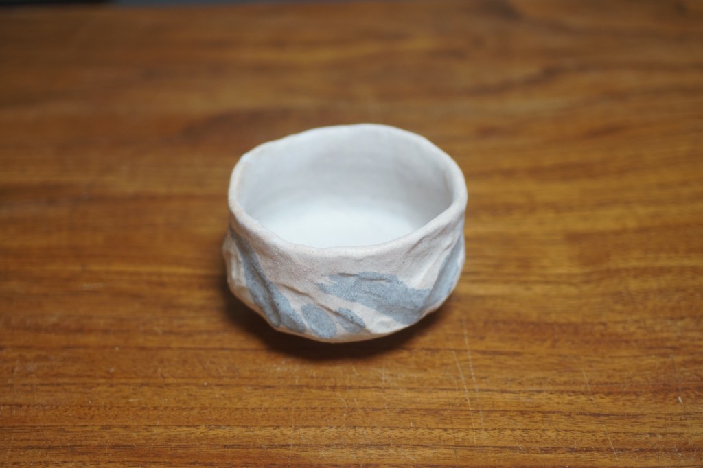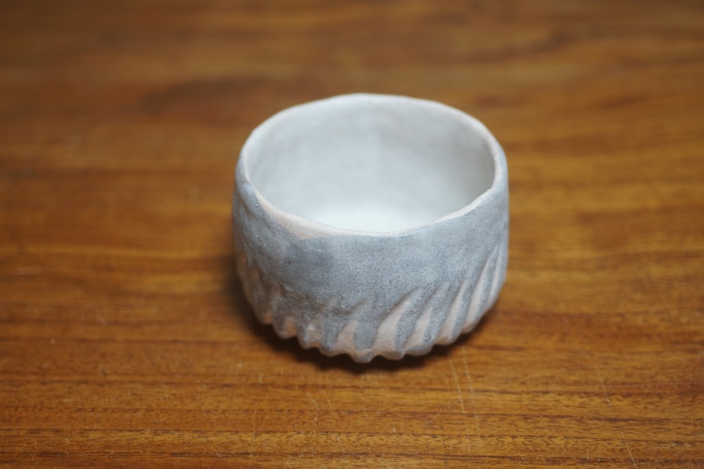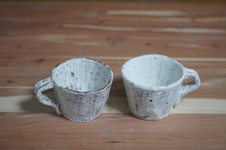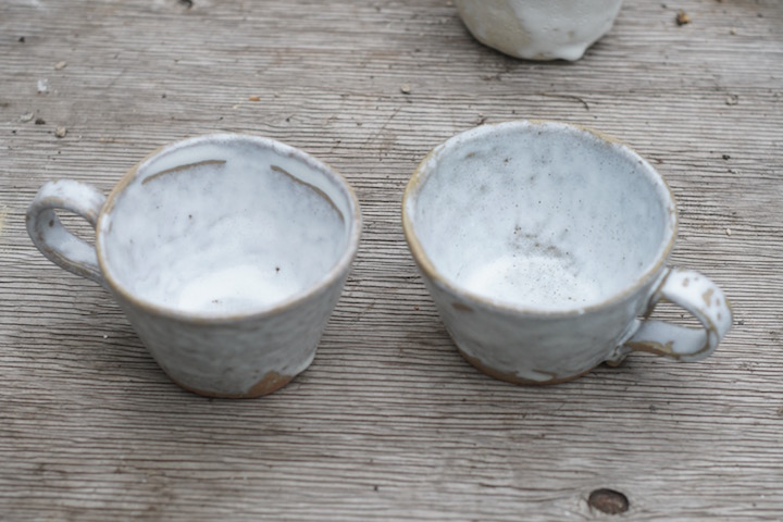 「紫月窯」に入られて初めて作った湯呑みとティーカップです。二つずつ作っていただきました。形を揃えるのは難しい事ですが初めての手びねりとは思えないほど揃っています。釉は調合したばかりの亜鉛白釉、工業用の微細な酸化亜鉛を使ったのがいけなかったのか釉が剥がれた所がたくさんできてしまいました。再度リタッチして焼いてみようと思います。