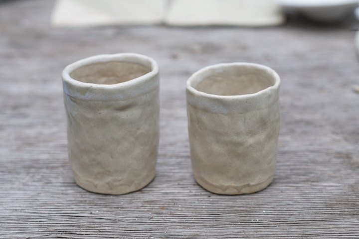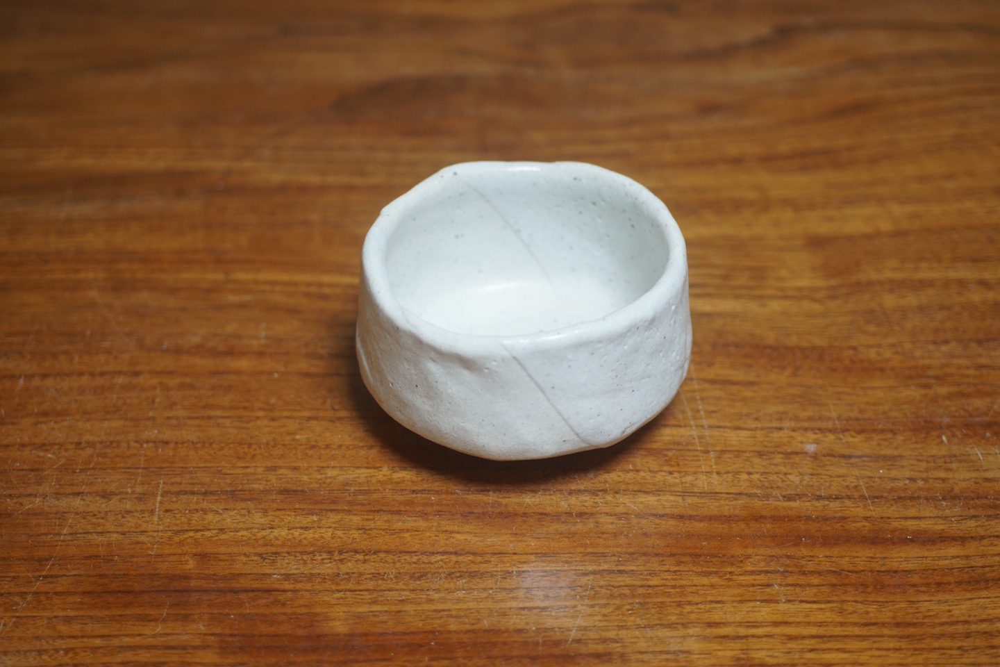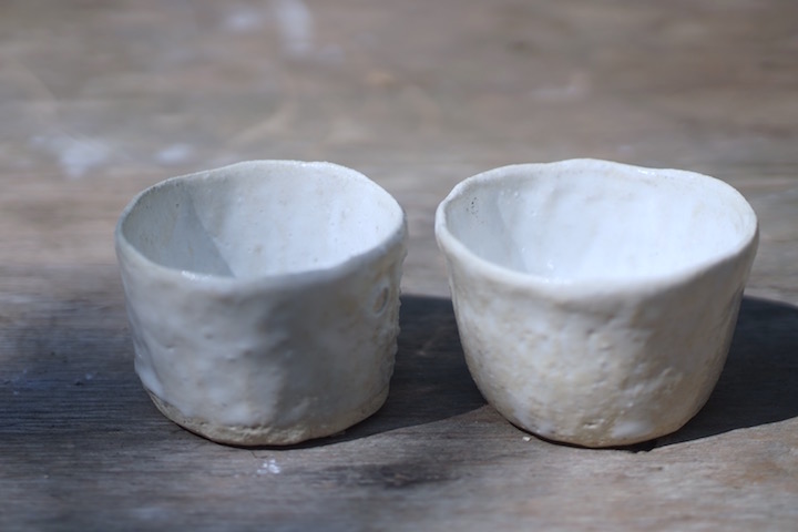 「紫月窯」で初めて作った作品。手びねりで同じ形の湯呑みを二つ作っていただきました。あえて指で押さえたテクスチャーを残し手びねりの温かさがある作品になりました。同じ乳白釉を口の所は二重掛けし変化を出しています。