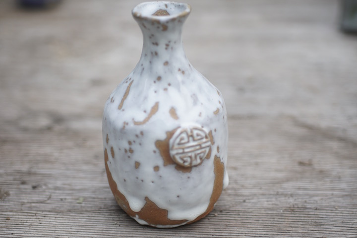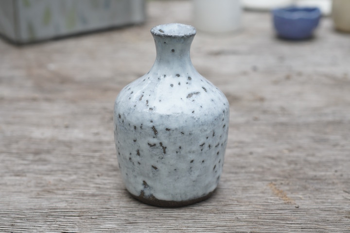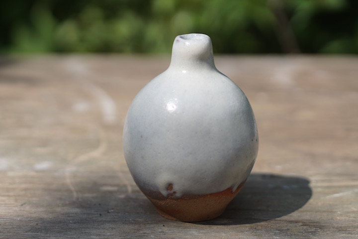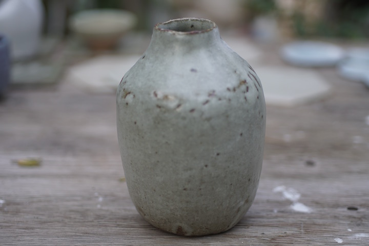 バランスのとれた袋物。丁寧に作られています。黒土に調合したての亜鉛白釉です。やはり釉が所々剥がれてしまいました。禿げた部分に加筆していただき再度焼成してみます。