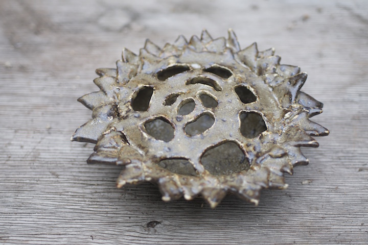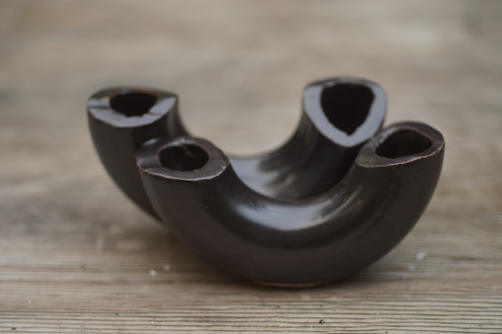 ユニークな形の花器。水平な板状の部分の形が変形しなかったのは穴をたくさん開け軽くしたためでしょうか。穴の部分は生花をアレンジするのに良い構造だと思います。釉は天目と籾灰の二重掛けです。