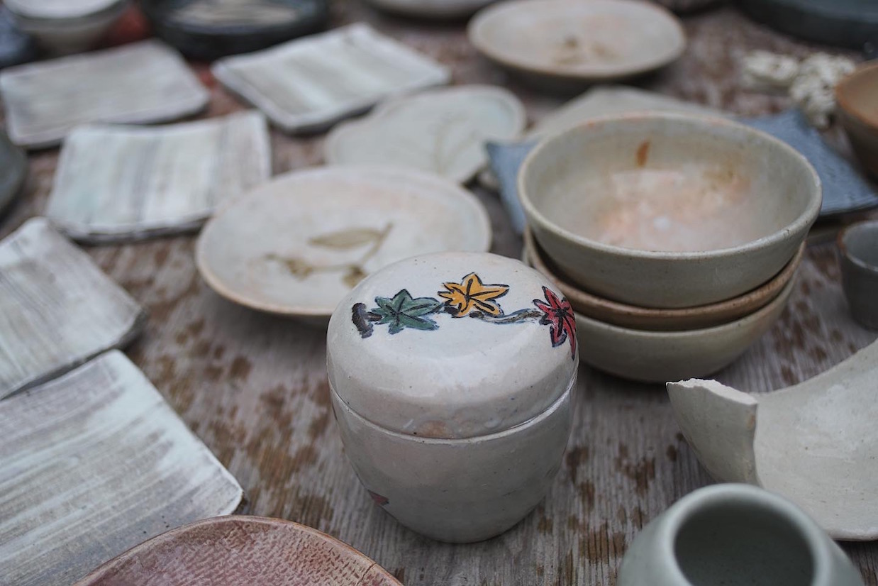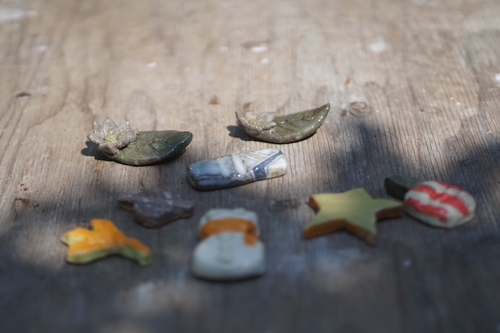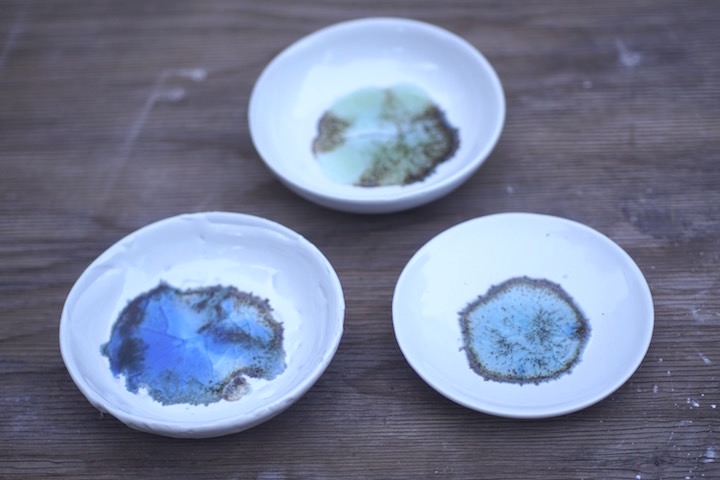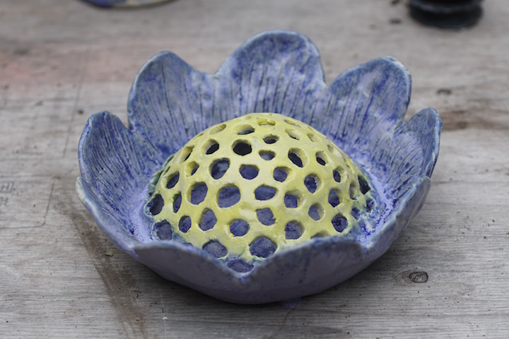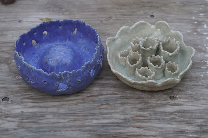 磁器土を使った手びねりの作品。磁器の作陶はたいへん難しいですが、根気よく確実に形作っています。左の作品は穴の部分に顔料を透明釉に混ぜてのせています。黄色の顔料が透明感が強くでました。