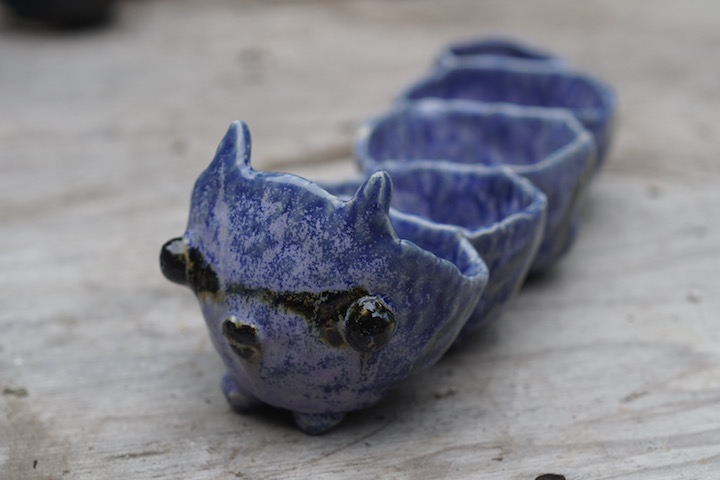 いつも個性的で温かな作品を作られています。今回の作品は個展に間に合わせようと釉を調合したのですがイメージ通りの色にはなりませんでした。複雑不思議な結晶がでた青い釉、これも良いと言っていただけました。