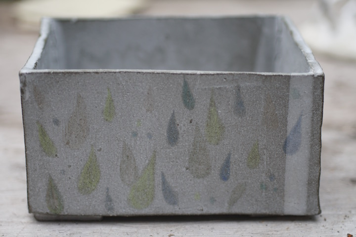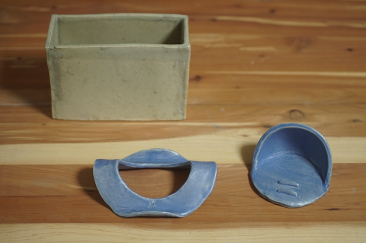 板作りの作品。書類などを入れる箱と携帯置きです。いつも身近な生活に役立つグッズを考えて作陶されています。