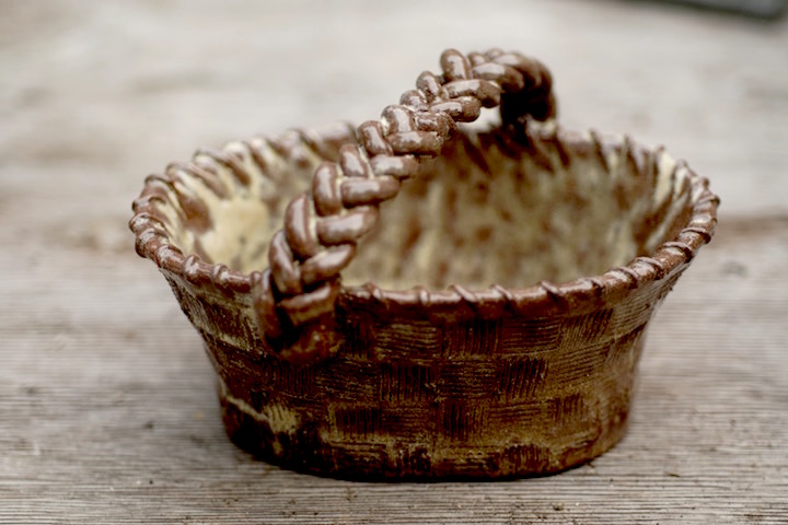 粘土を編んだり竹のようなテクスチャーを作ったりした籠。細かな細工が見事です。