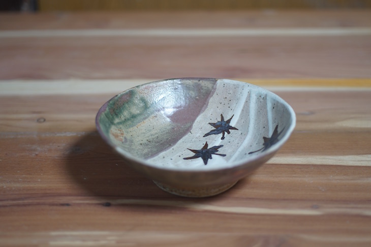電動轆轤で作られた様に見えますが、手びねりで丁寧に作られた作品。鬼板で彩色されたもみじの葉が生かされた織部風の作品です。
