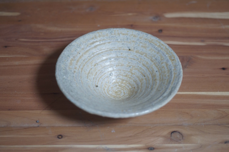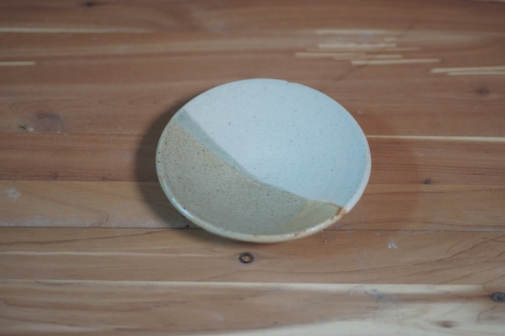 電動轆轤を使ったこの作品もいいですね。土灰釉と黄瀬戸釉、二つの夕を半分ずつ掛け中央で交差させています。ほんの少し重なったところの色の変化がおしゃれです。