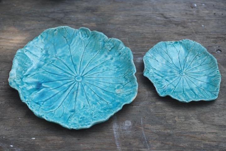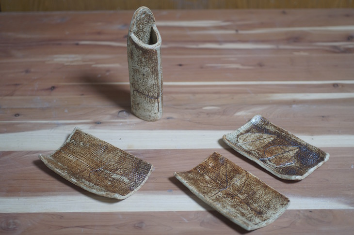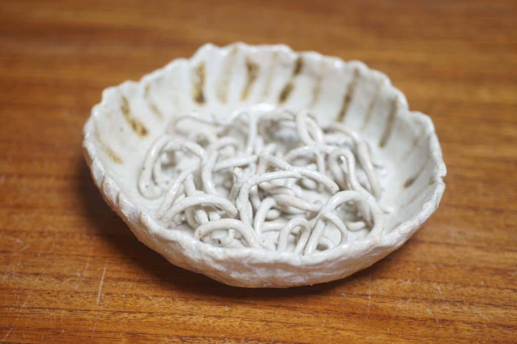 左の作品は花器として使えます。細いお蕎麦のような紐は花を自由に支える剣山の様に使えます。魚の形をしたお皿は焼き魚を乗せるとぴったり合いそうです。