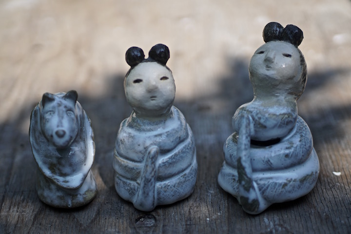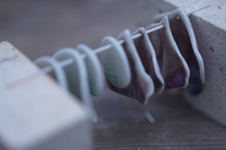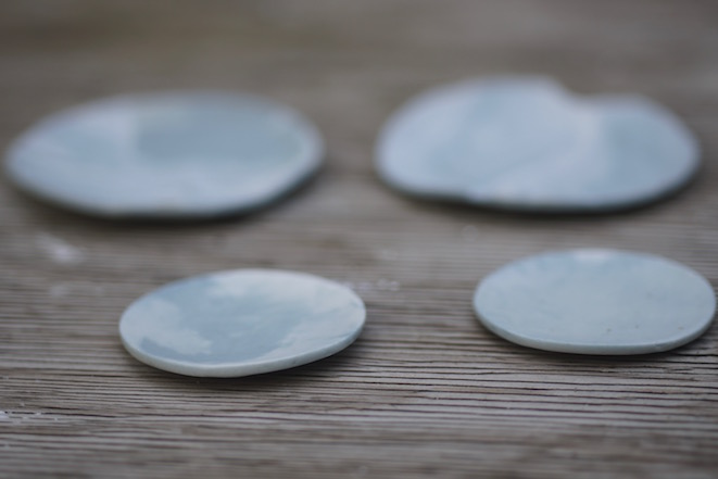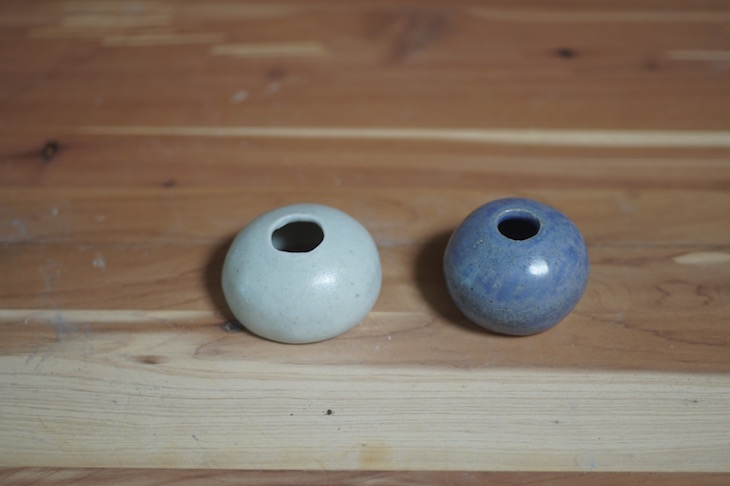 後ろの黒い色のオブジェは一度天目釉を酸化で焼いたもの、思うような色にならなく再度酸化鉄に少し長石を混ぜた釉で還元焼成してみました。やはりイメージとは懸け離れた色になってしまいました。釉は難しいです。手前の二つの丸い作品は風鈴のパーツです。こちらは涼しげな淡い青磁になりました。